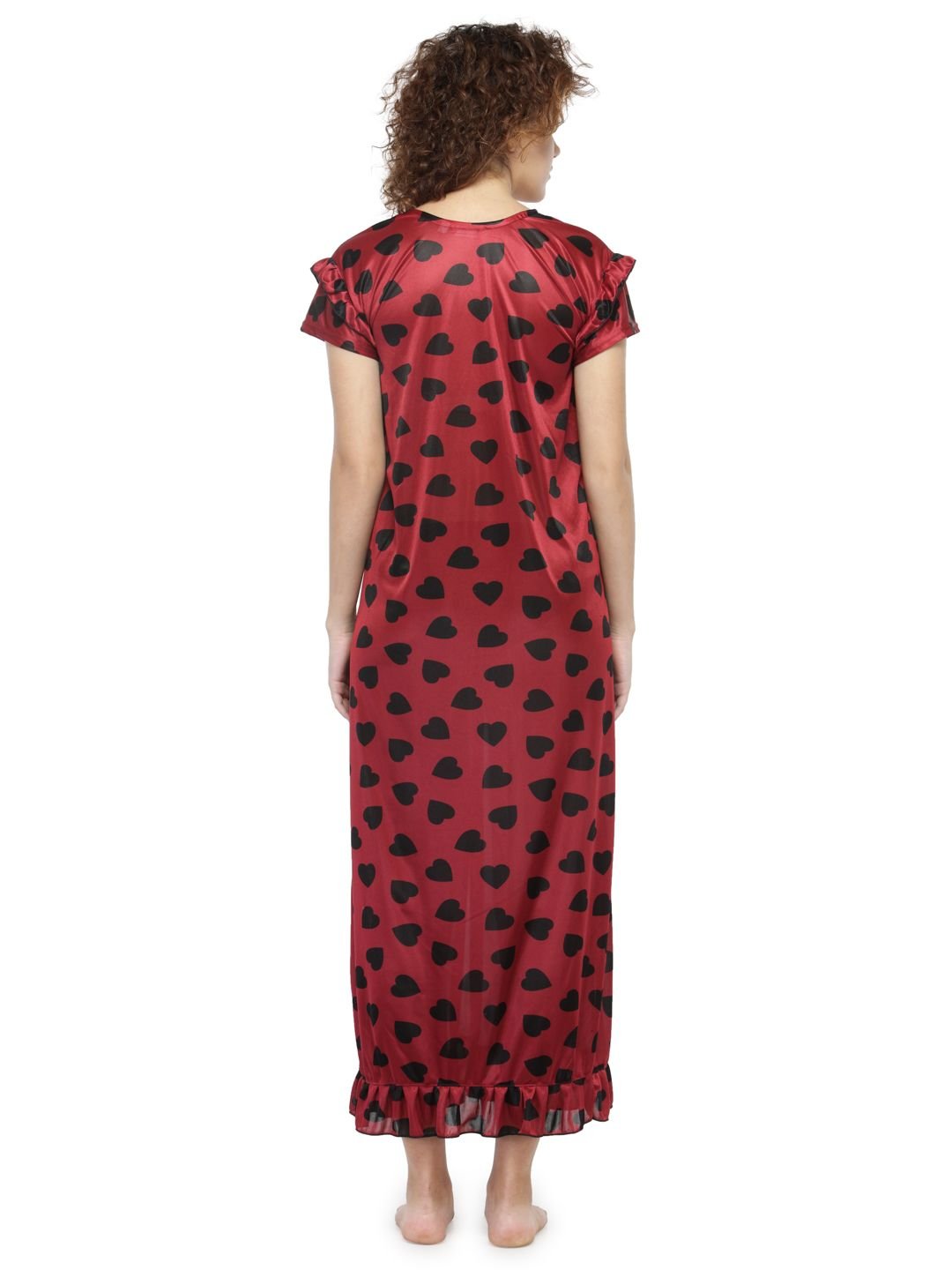 A classic, elegant long Satin nighty. Purple printed maxi nightdress with black accents, has a scoop neck with taping along the neckline and on the front, short sleeves with ruffle detail on either side of the shoulders, ruffle detail along the hemline.