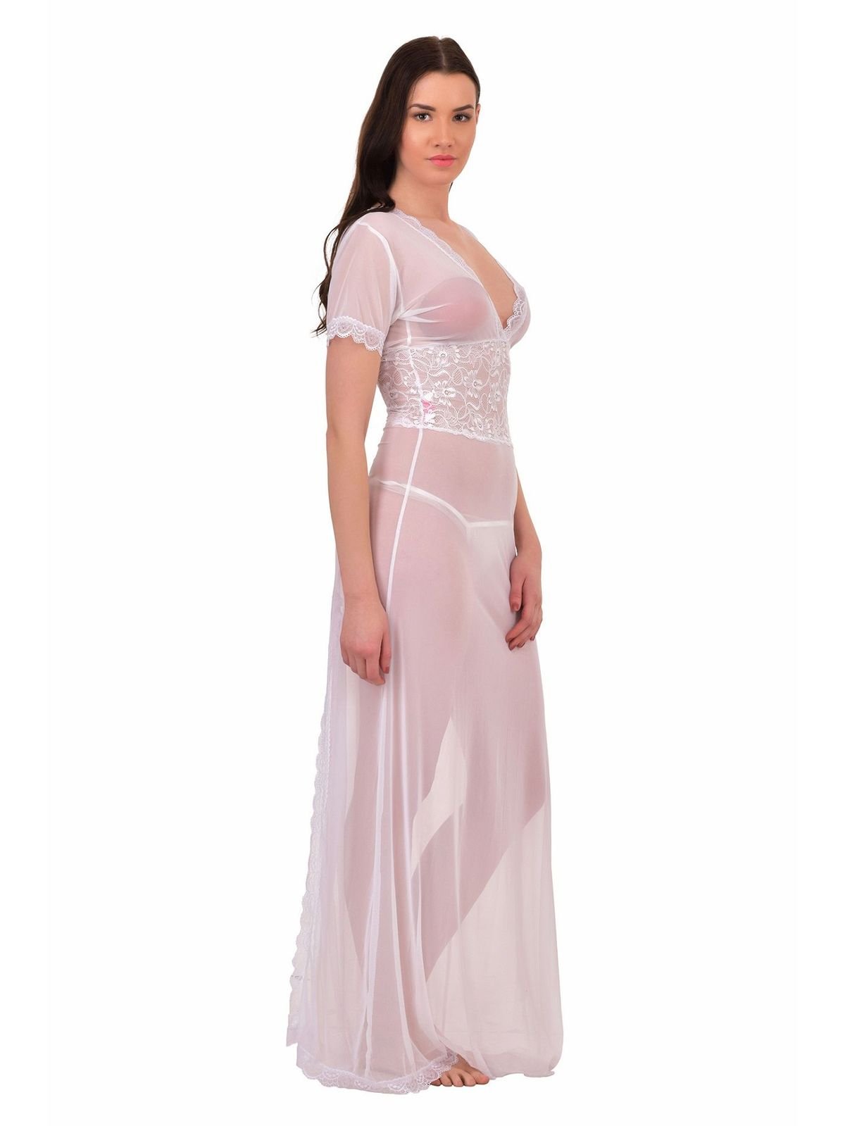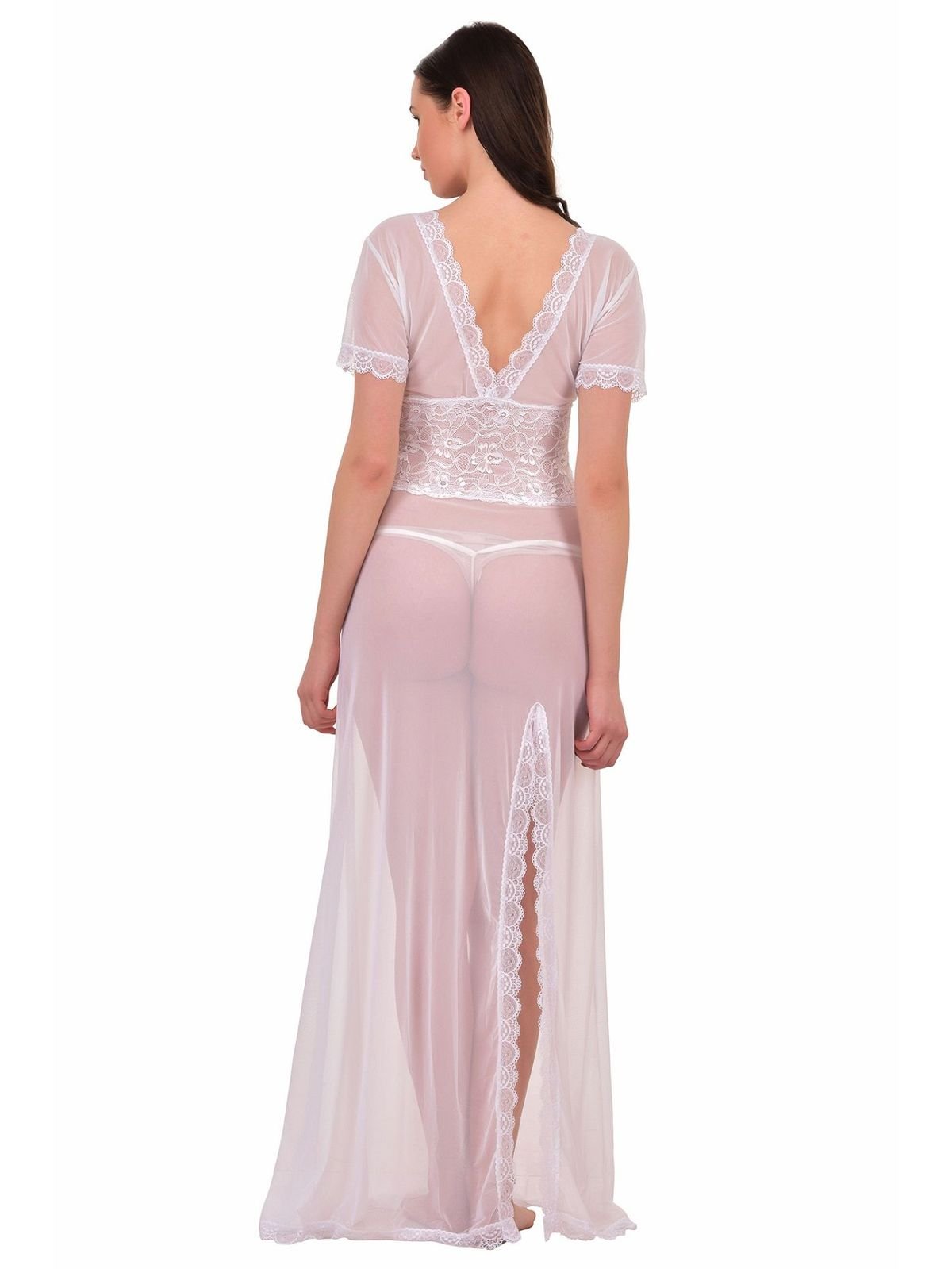 For a well-planned night, this gown is very lovely to make your intimate lover cheer up for your alluring silhouette. this mesh gown with lace detail waistline enhancing you a curve, scalloped lace V-neck on both front and back, flirty split to the thigh and thong matched. Mesh Nightgown Highly Comfortable Includes: Nightgown, G-String