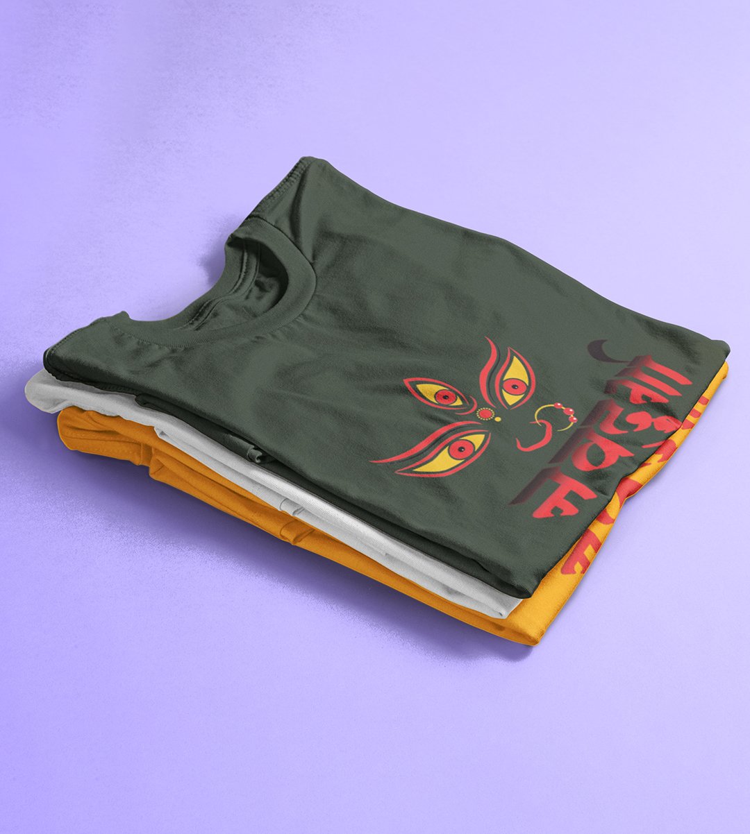 Navratri is a very auspicious festival for hindus. It takes place at the beginning of October and sometimes September. Enjoy the 9 days of festivities with full zeal and make yourself submerged in the love of Maa Durga. Navratri is also known as Durga Puja. And with this Tees, you can shine like a star during this festive season with our navratri themed cotton half sleeved Tshirts. You can pair our t-shirts with trousers and denim of your choice and make it a weekday smart casual or weekend wear. This is durable. This tshirt is smooth and soft which makes you comfortable to wear during all seasons. The printing in it is durable and odourless. It has five sizes, S,M,L,XL,XXL. The Tshirt colour is intact even after repeated washes. It can be kept in your wardrobe and hangers. Please avoid washing mashine to clean this Tee, it may affect the print. Hand wash only. We have brought you many navratri related designs printed on our different colour Tshirts to choose from. Grab it now.