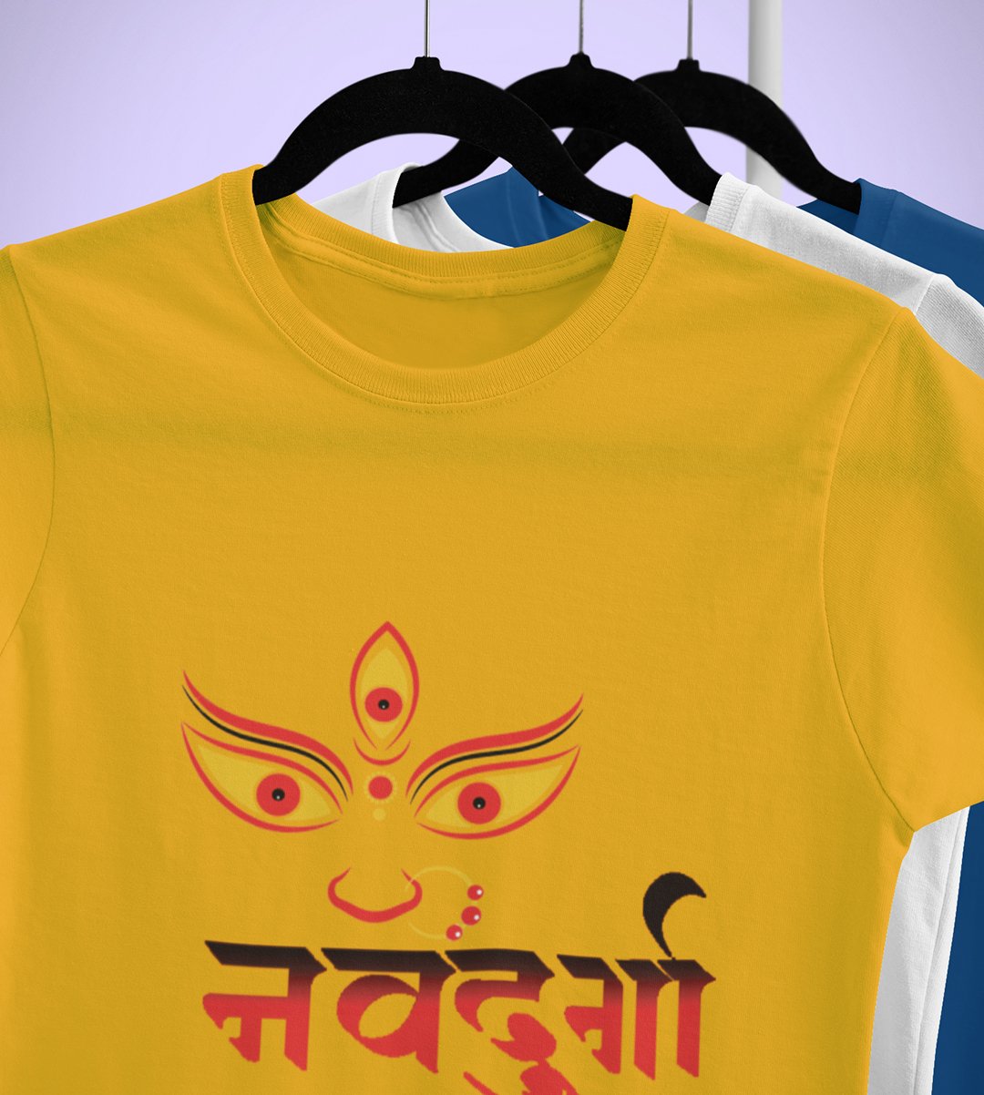 Navdurga printed unisex adults round neck cotton half-sleeve yellow tshirt specially for Navratri festival/ Durga puja