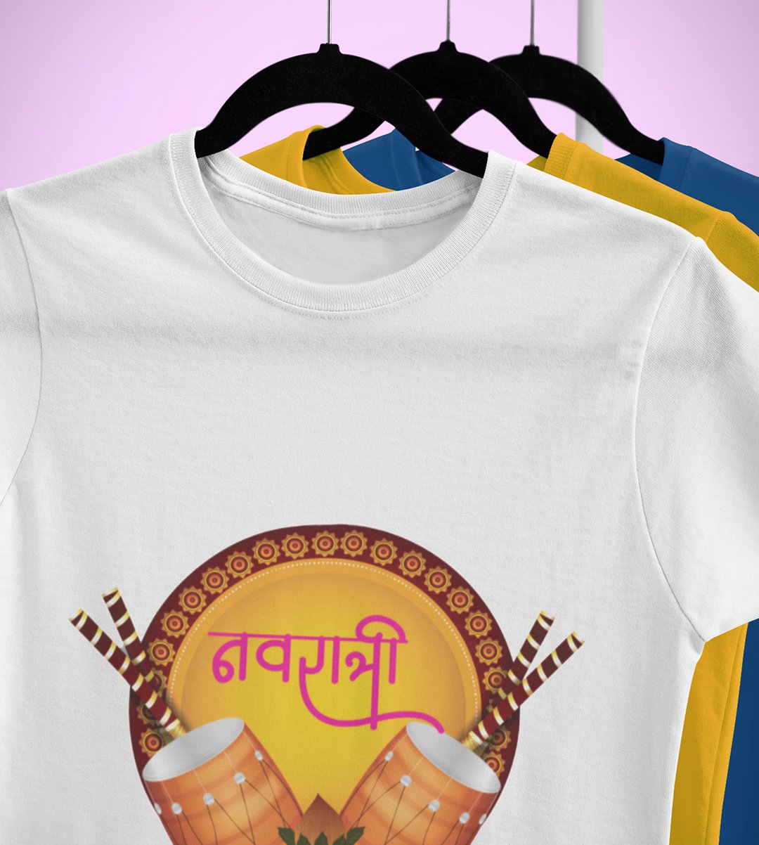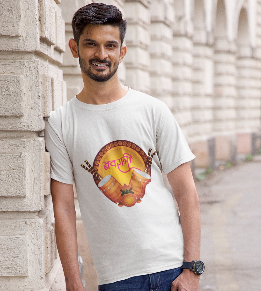 Navratri is a very auspicious festival for hindus. It takes place at the beginning of October and sometimes September. Enjoy the 9 days of festivities with full zeal and make yourself submerged in the love of Maa Durga. Navratri is also known as Durga Puja. And with this Tees, you can shine like a star during this festive season with our navratri themed cotton half sleeved Tshirts. You can pair our t-shirts with trousers and denim of your choice and make it a weekday smart casual or weekend wear. This is durable. This tshirt is smooth and soft which makes you comfortable to wear during all seasons. The printing in it is durable and odourless. It has five sizes, S,M,L,XL,XXL. The Tshirt colour is intact even after repeated washes. It can be kept in your wardrobe and hangers. Please avoid washing mashine to clean this Tee, it may affect the print. Hand wash only. We have brought you many navratri related designs printed on our different colour Tshirts to choose from. Grab it now.