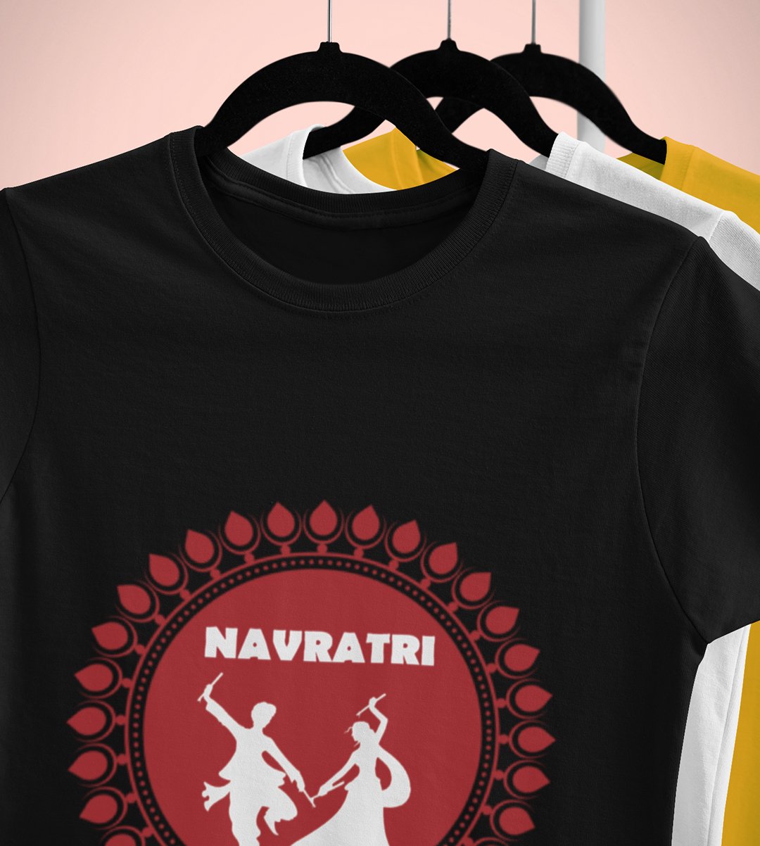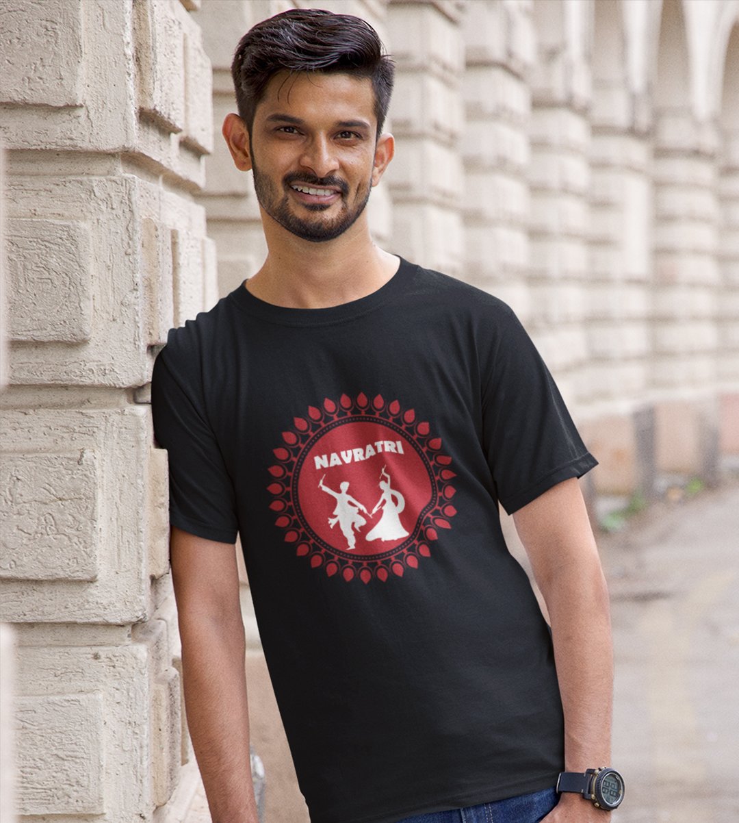 Navratri is a very auspicious festival for hindus. It takes place at the beginning of October and sometimes September. Enjoy the 9 days of festivities with full zeal and make yourself submerged in the love of Maa Durga. Navratri is also known as Durga Puja. And with this Tees, you can shine like a star during this festive season with our navratri themed cotton half sleeved Tshirts. You can pair our t-shirts with trousers and denim of your choice and make it a weekday smart casual or weekend wear. This is durable. This tshirt is smooth and soft which makes you comfortable to wear during all seasons. The printing in it is durable and odourless. It has five sizes, S,M,L,XL,XXL. The Tshirt colour is intact even after repeated washes. It can be kept in your wardrobe and hangers. Please avoid washing mashine to clean this Tee, it may affect the print. Hand wash only. We have brought you many navratri related designs printed on our different colour Tshirts to choose from. Grab it now.