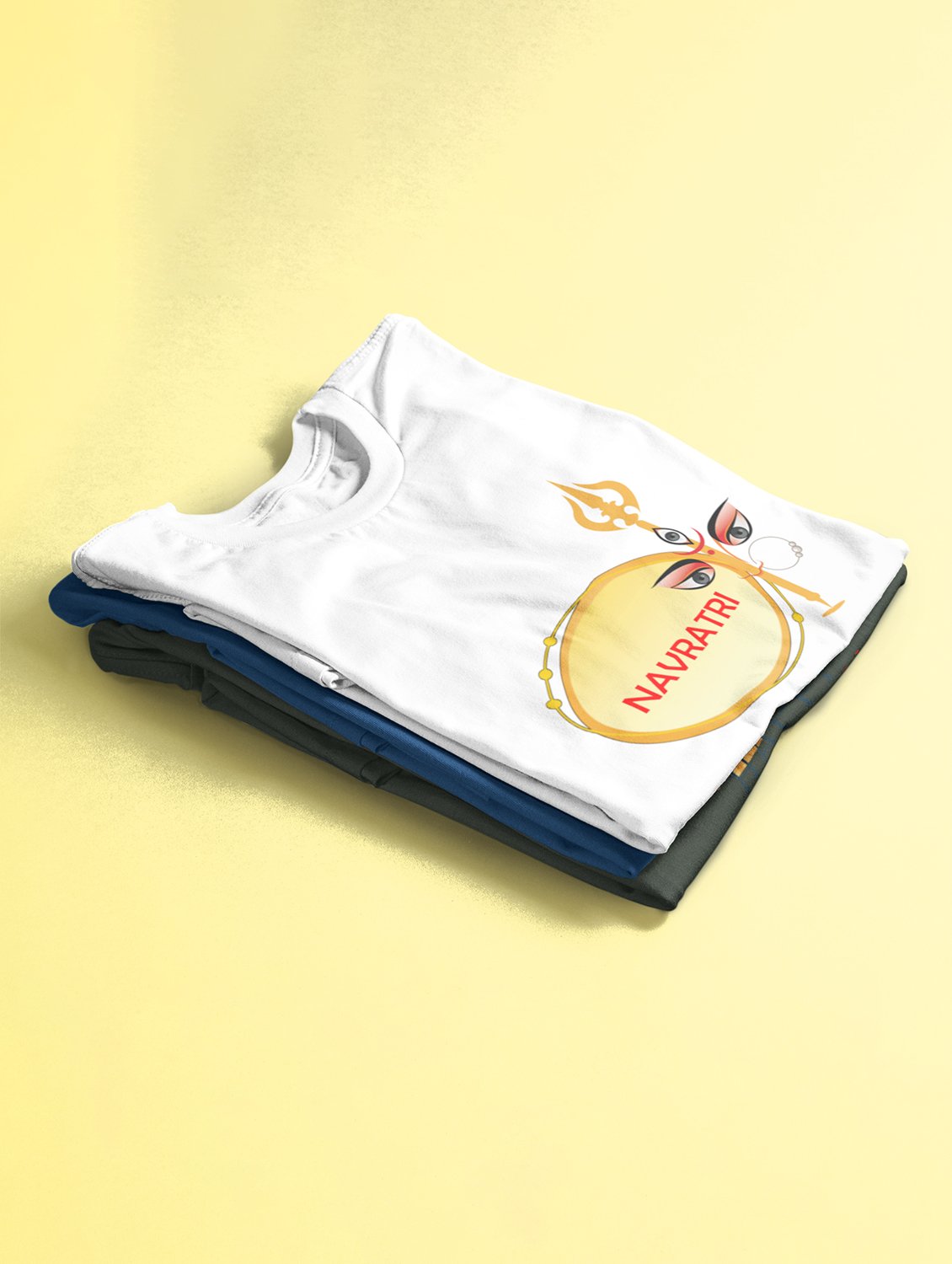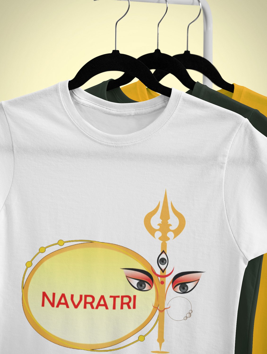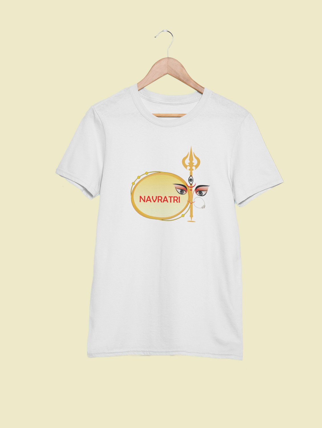 Navratri is a very auspicious festival for hindus. It takes place at the beginning of October and sometimes September. Enjoy the 9 days of festivities with full zeal and make yourself submerged in the love of Maa Durga. Navratri is also known as Durga Puja. And with this Tees, you can shine like a star during this festive season with our navratri themed cotton half sleeved Tshirts. You can pair our t-shirts with trousers and denim of your choice and make it a weekday smart casual or weekend wear. This is durable. This tshirt is smooth and soft which makes you comfortable to wear during all seasons. The printing in it is durable and odourless. It has five sizes, S,M,L,XL,XXL. The Tshirt colour is intact even after repeated washes. It can be kept in your wardrobe and hangers. Please avoid washing mashine to clean this Tee, it may affect the print. Hand wash only. We have brought you many navratri related designs printed on our different colour Tshirts to choose from. Grab it now.