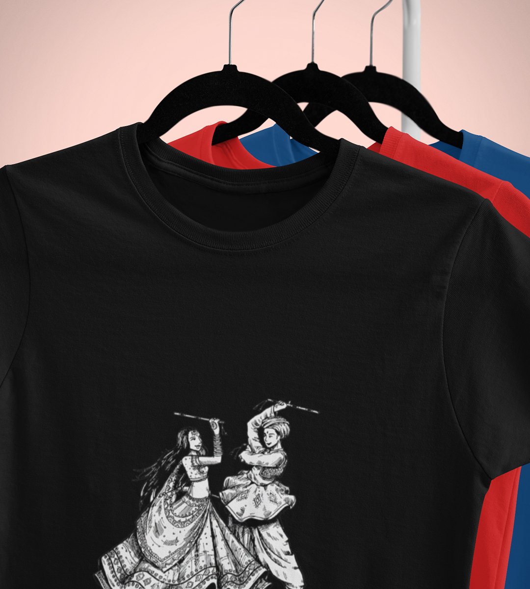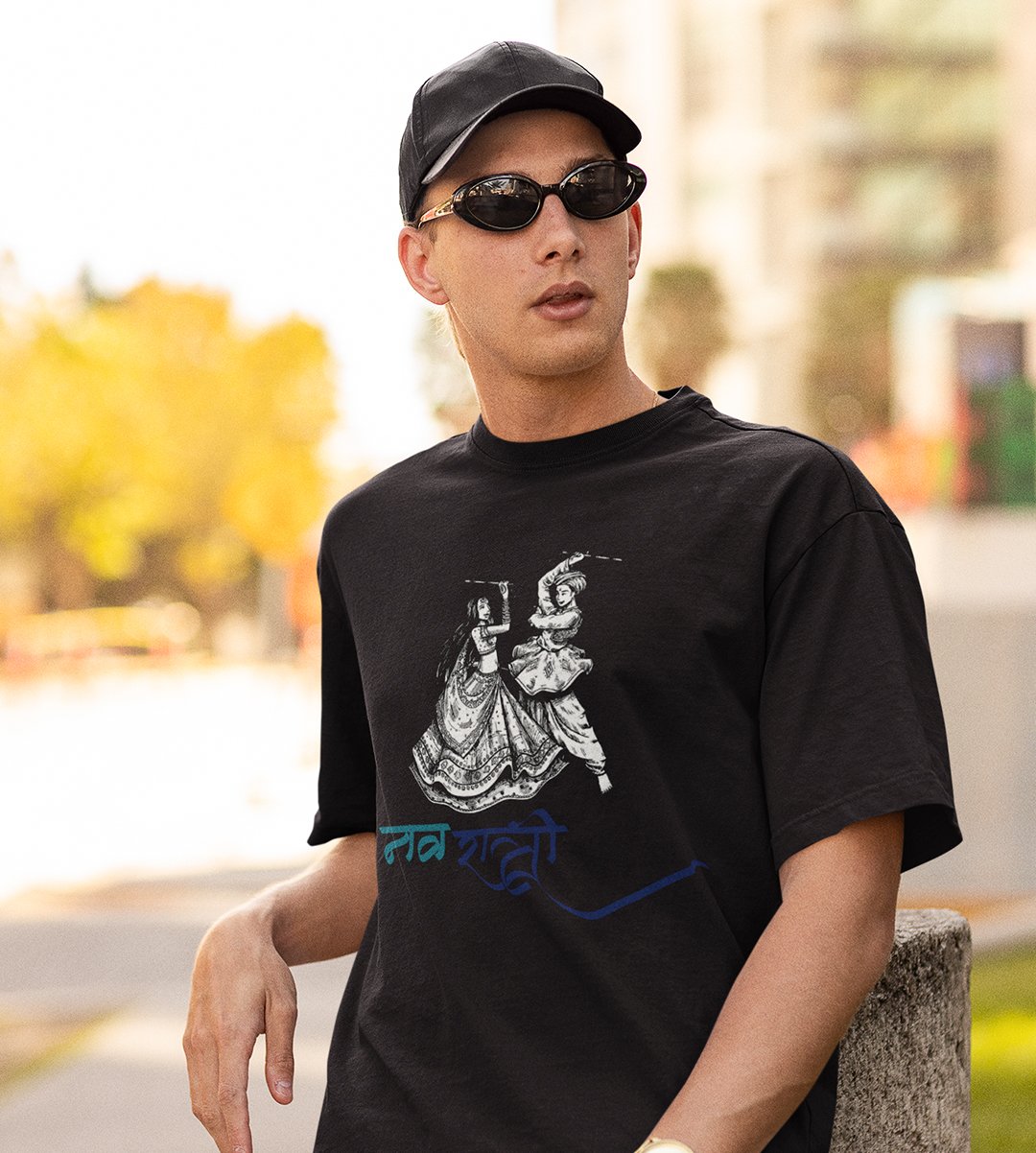 Navratri (playing Dandiya) printed unisex adults round neck cotton half-sleeve black tshirt specially for Navratri festival/ Durga puja