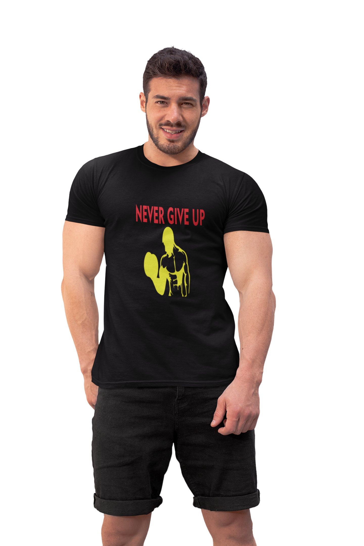 Never Give Up, (BG Yellow), Round Neck Gym Tshirt (Black Tshirt) - Clothes for Gym Lovers - Suitable for Gym Going Person - Foremost Gifting Material for Your Friends and Close Ones