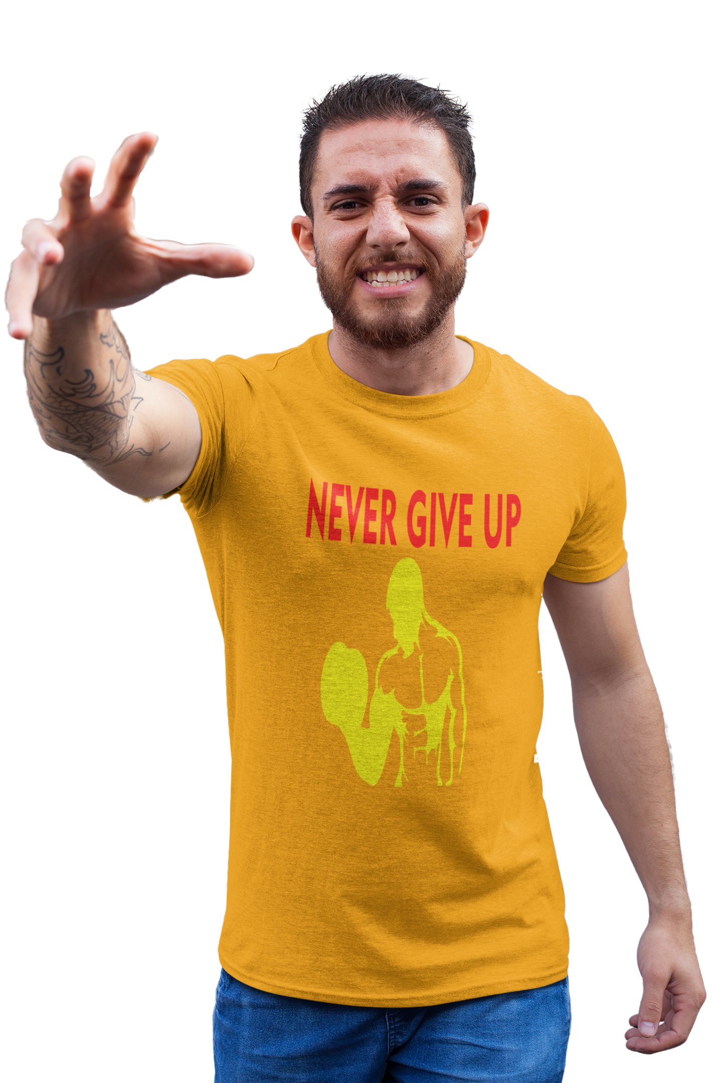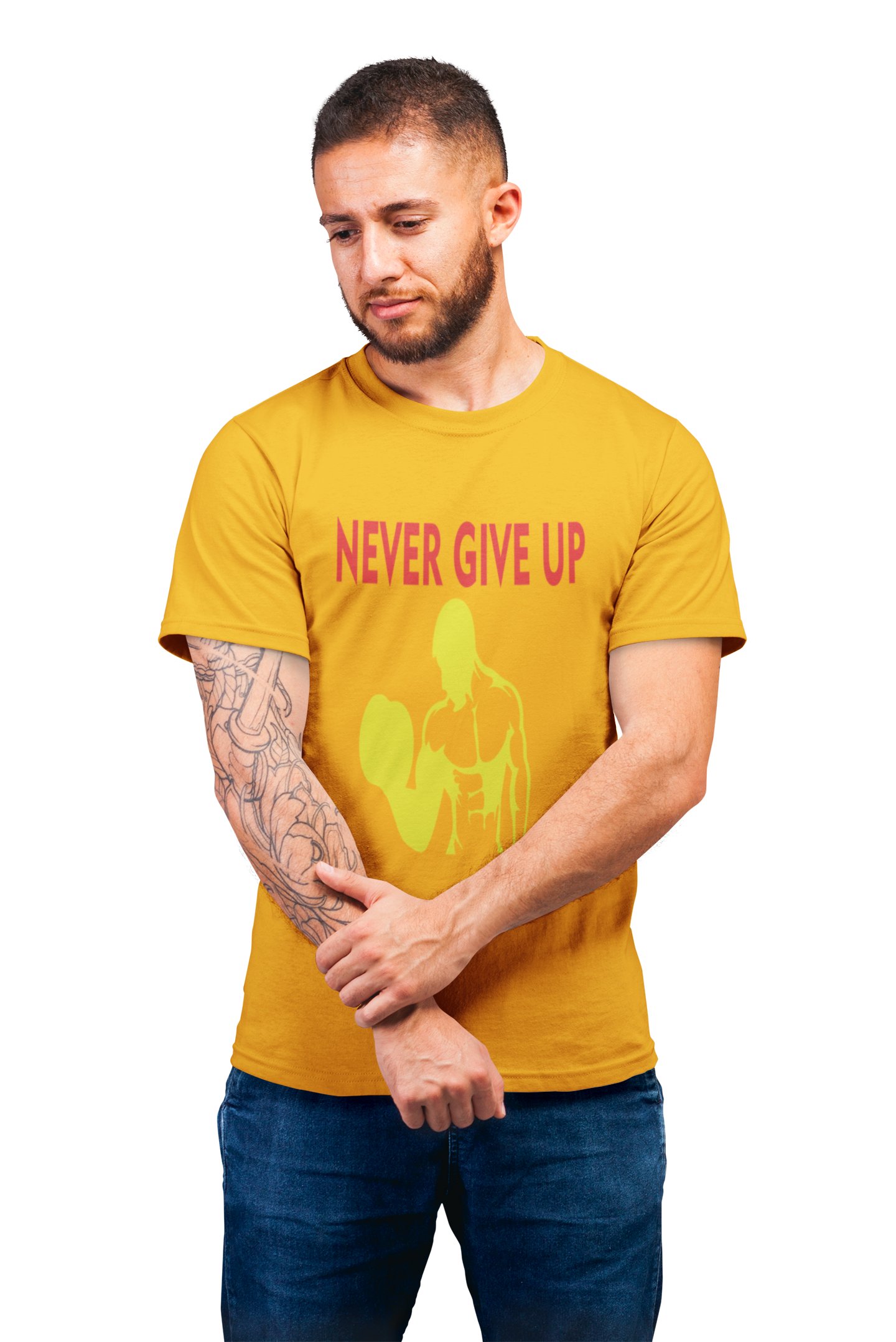 Never Give Up, Muscle Man- Yellow, Round Neck Gym Tshirt (Yellow Tshirt) - Clothes for Gym Lovers - Suitable for Gym Going Person - Foremost Gifting Material for Your Friends and Close Ones
