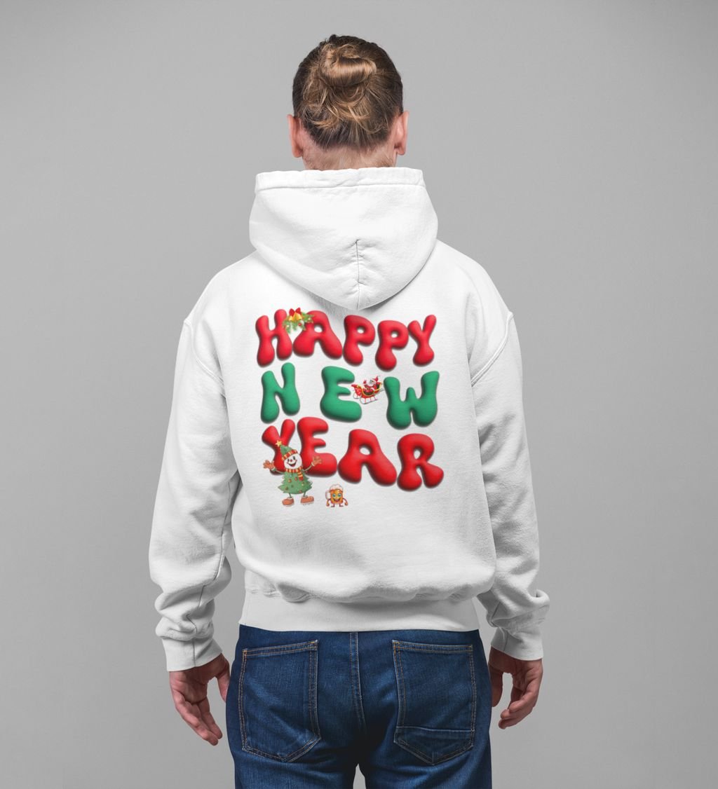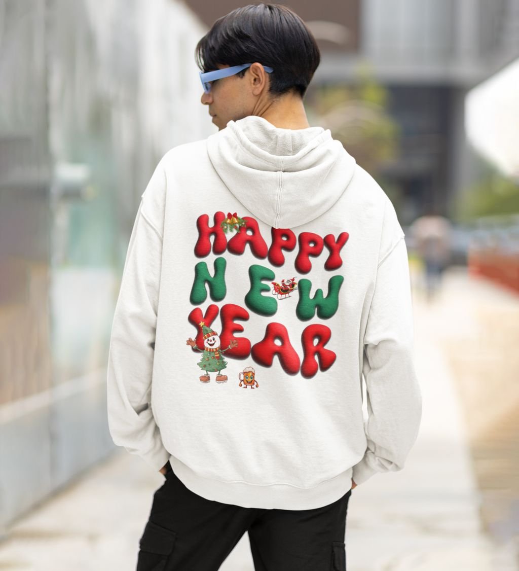 New Year Celebration with Snowman and Confetti Happy New Year Printed White Cotton Hoodie
