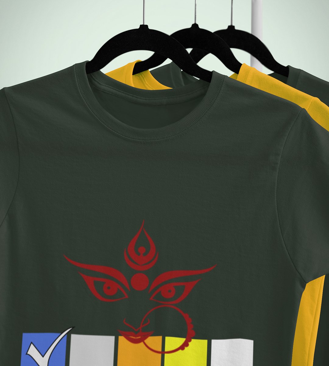 Navratri is a very auspicious festival for hindus. It takes place at the beginning of October and sometimes September. Enjoy the 9 days of festivities with full zeal and make yourself submerged in the love of Maa Durga. Navratri is also known as Durga Puja. And with this Tees, you can shine like a star during this festive season with our navratri themed cotton half sleeved Tshirts. You can pair our t-shirts with trousers and denim of your choice and make it a weekday smart casual or weekend wear. This is durable. This tshirt is smooth and soft which makes you comfortable to wear during all seasons. The printing in it is durable and odourless. It has five sizes, S,M,L,XL,XXL. The Tshirt colour is intact even after repeated washes. It can be kept in your wardrobe and hangers. Please avoid washing mashine to clean this Tee, it may affect the print. Hand wash only. We have brought you many navratri related designs printed on our different colour Tshirts to choose from. Grab it now.