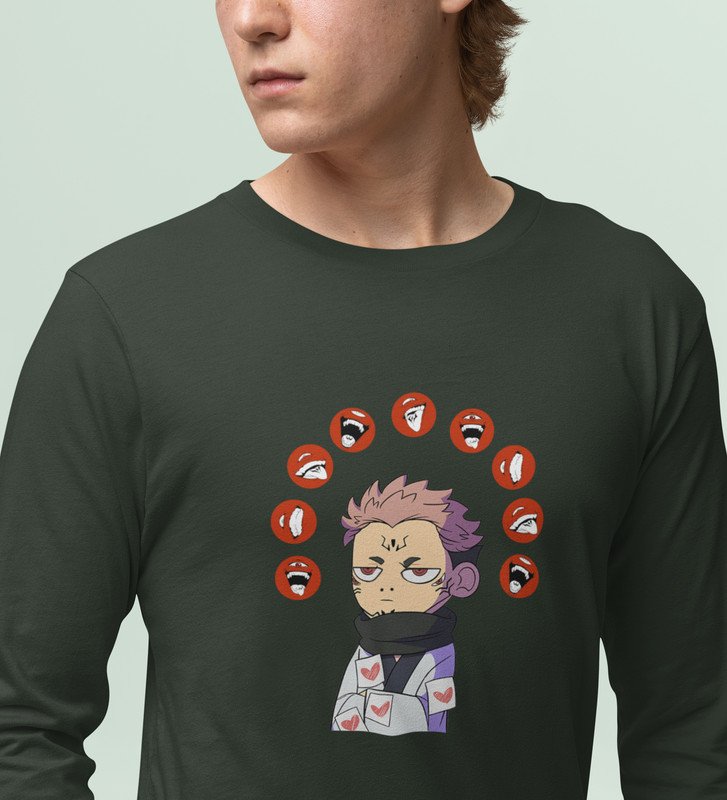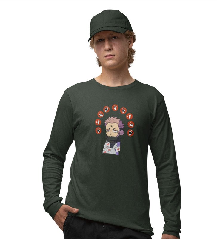 Nine Faced Itadori Cotton Green Printed Full Sleeves Tshirt For Mens and Boys