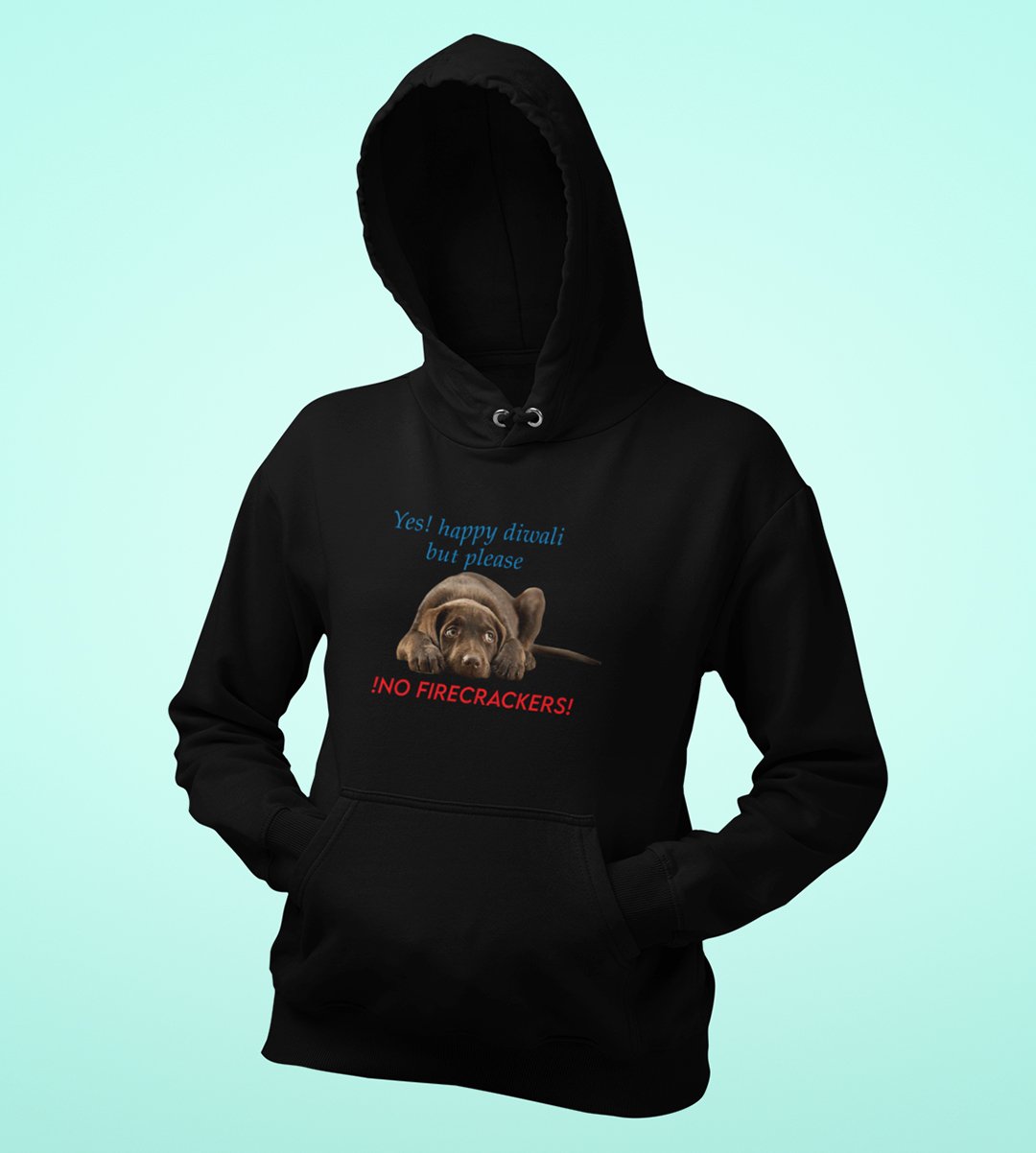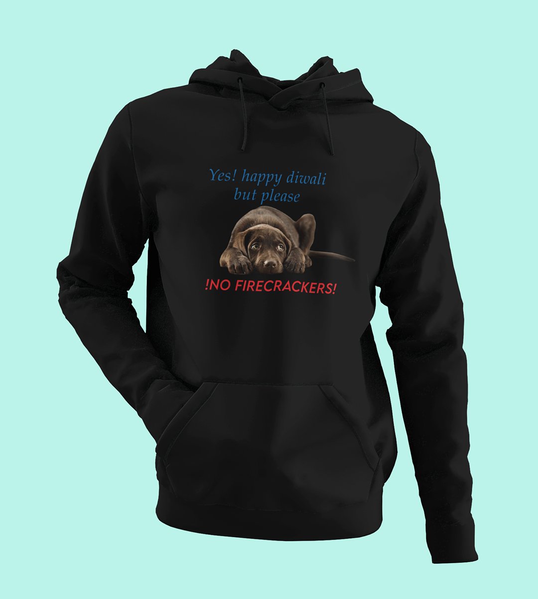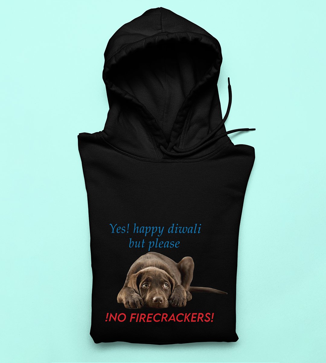 This Diwali, let a cute dog deliver a heartwarming message. Our "No Firecracker" black Hoodie is all about spreading love and compassion, as the dog says, "Yes Happy Diwali, But Please No Firecracker." It's a delightful reminder to celebrate with care and concern for our furry friends. Share this adorable design and the spirit of animal love during the festival of lights.