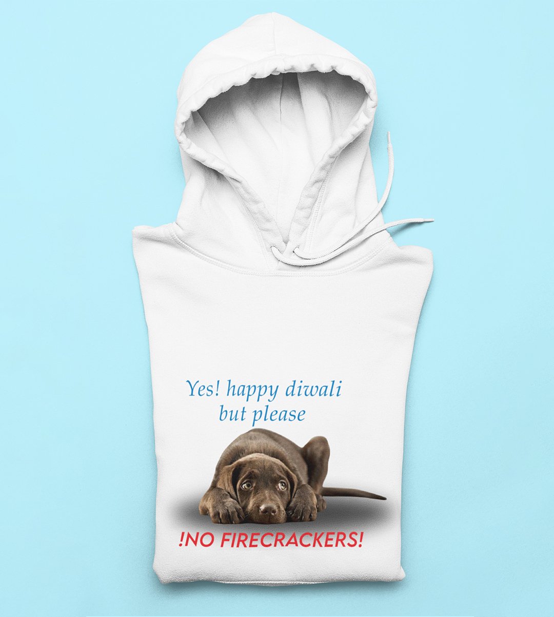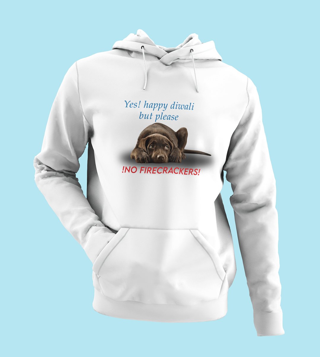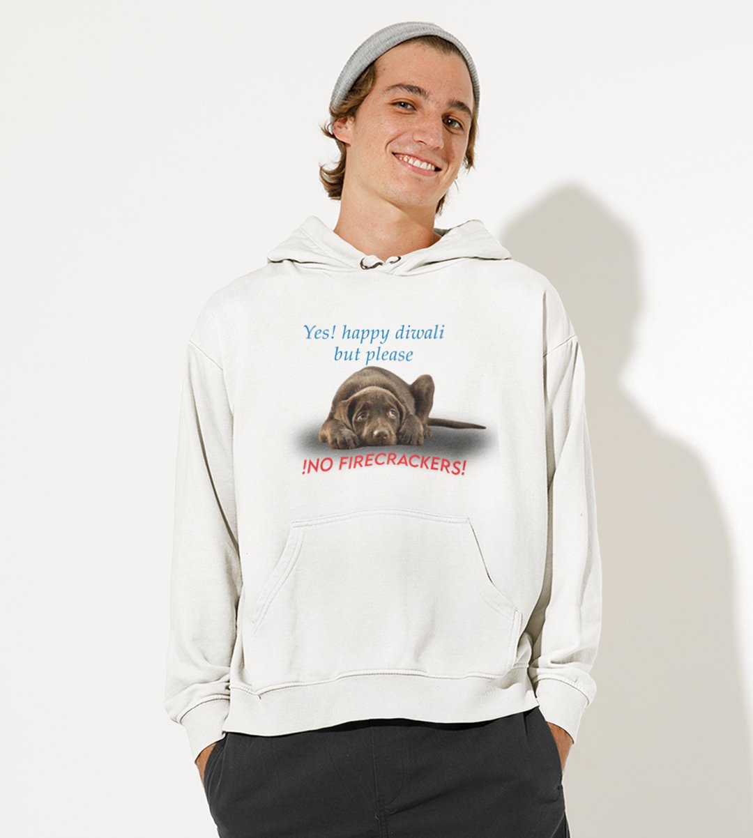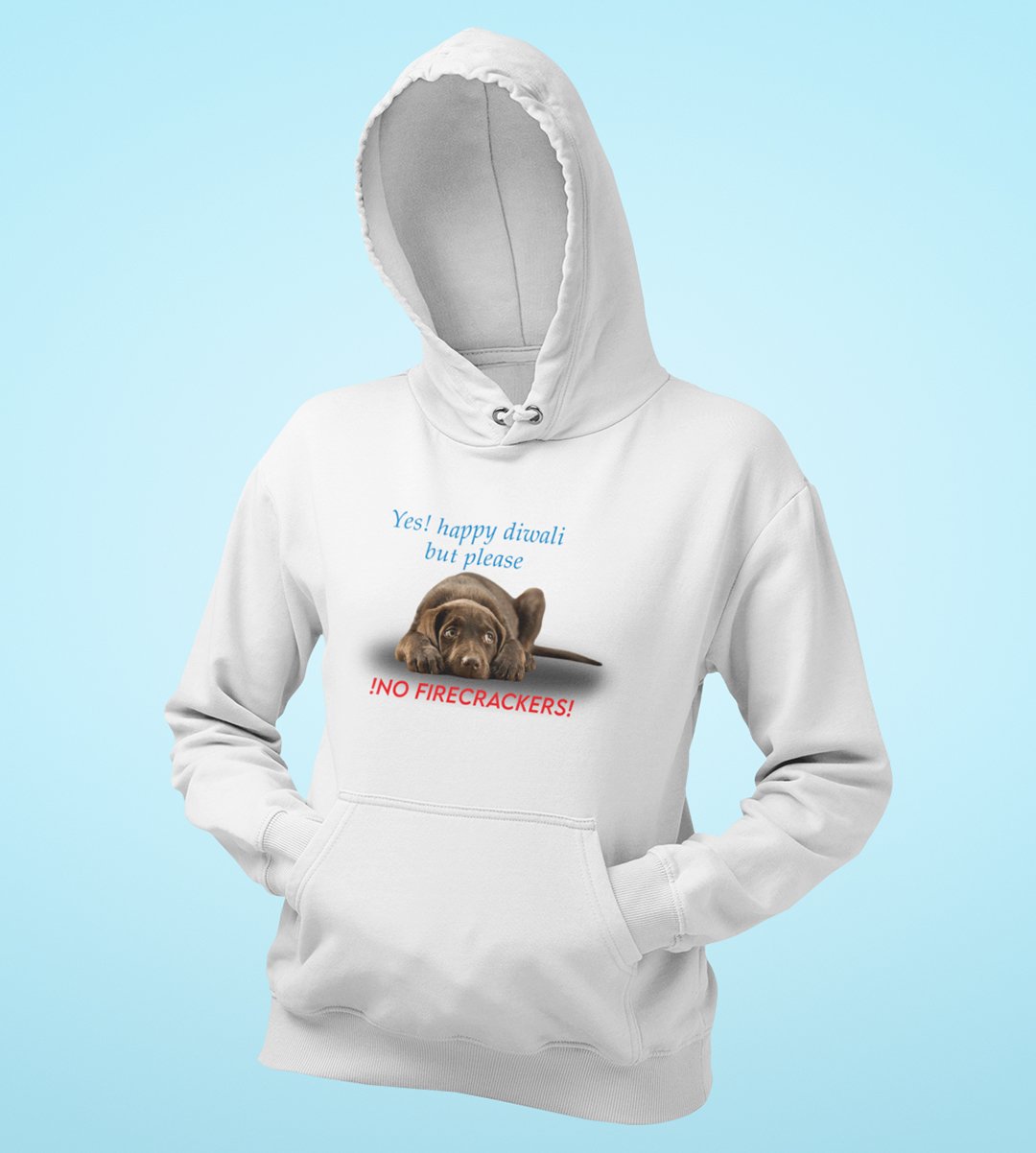 This Diwali, let a cute dog deliver a heartwarming message. Our "No Firecracker" White Hoodie is all about spreading love and compassion, as the dog says, "Yes Happy Diwali, But Please No Firecracker." It's a delightful reminder to celebrate with care and concern for our furry friends. Share this adorable design and the spirit of animal love during the festival of lights.