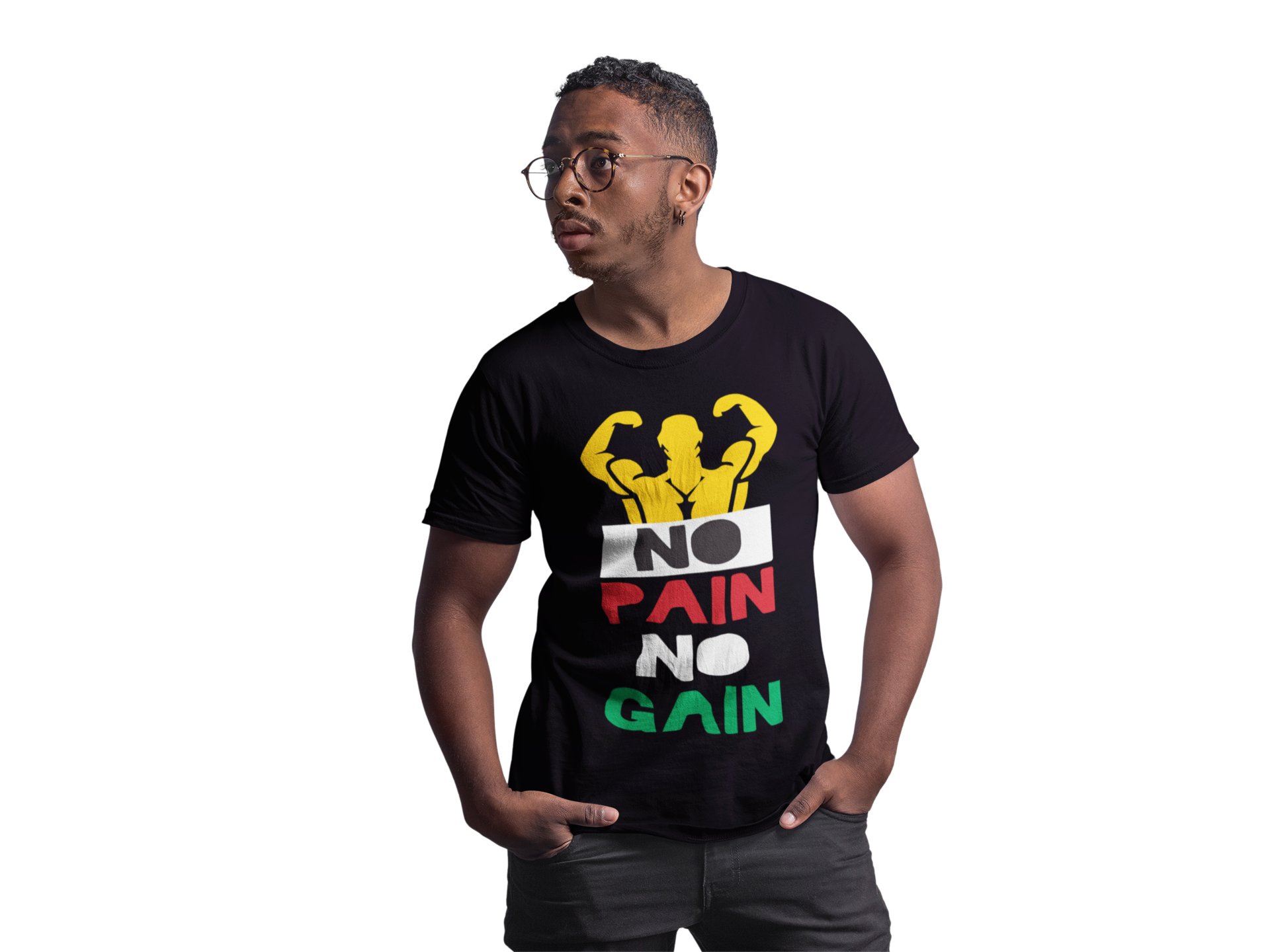 No Pain, No Gain, (BG Yellow, Black, Red and Green), Round Neck Gym Tshirt (White Tshirt) - Clothes for Gym Lovers - Suitable for Gym Going Person - Foremost Gifting Material for Your Friends and Close Ones