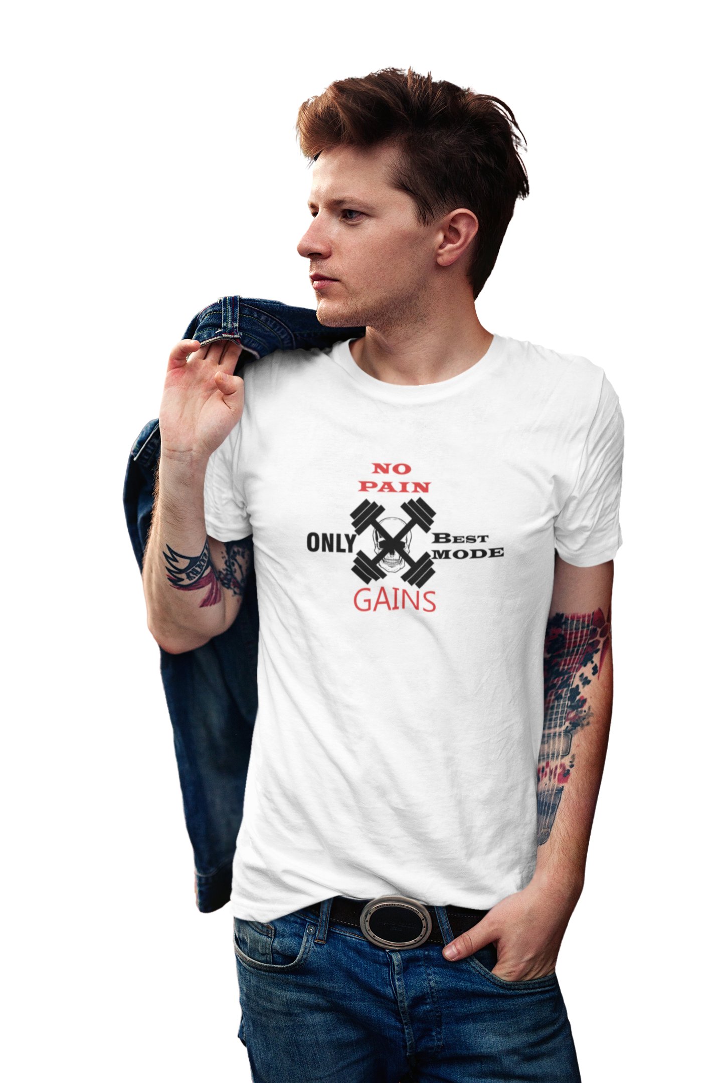 No Pain, Only Beat Mode Gains, (BG Red and Black), Round Neck Gym Tshirt (White Tshirt) - Clothes for Gym Lovers - Suitable for Gym Going Person - Foremost Gifting Material for Your Friends and Close Ones