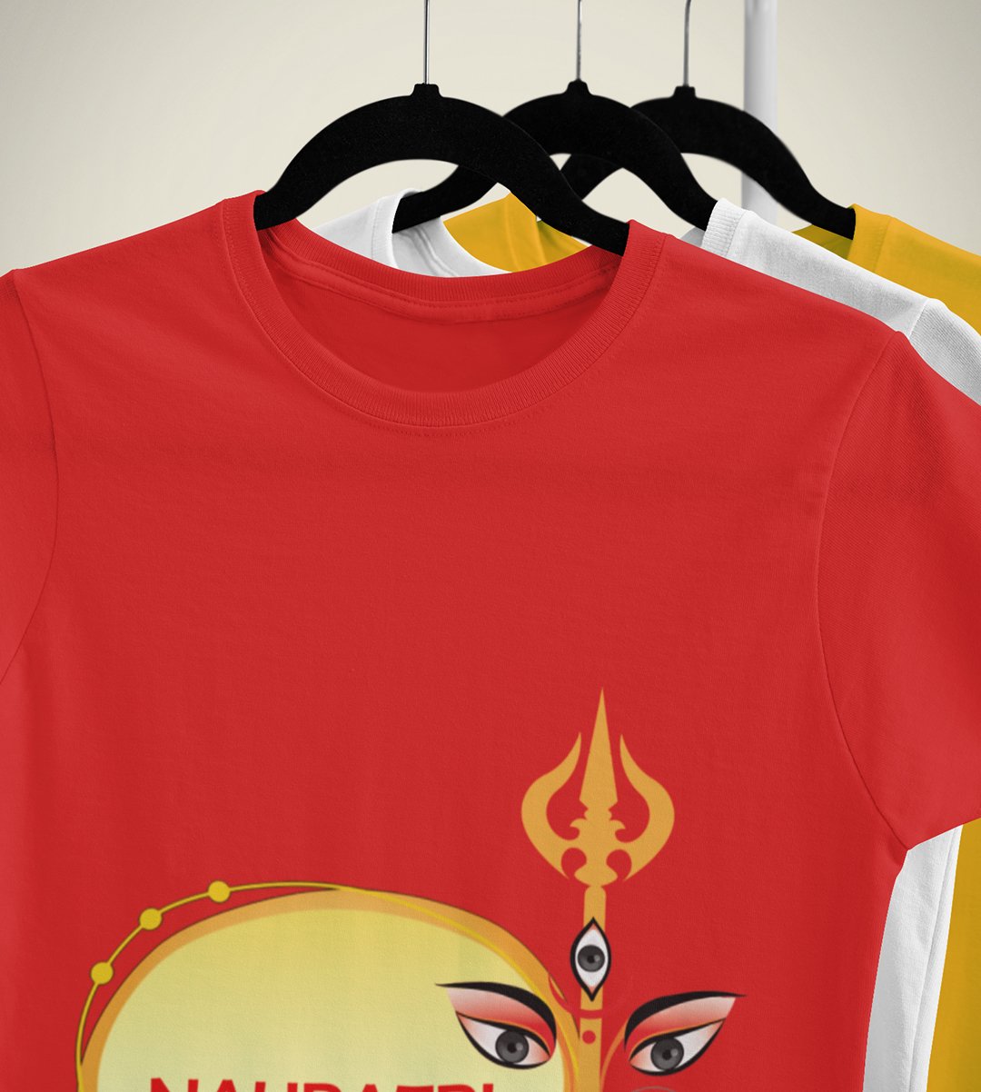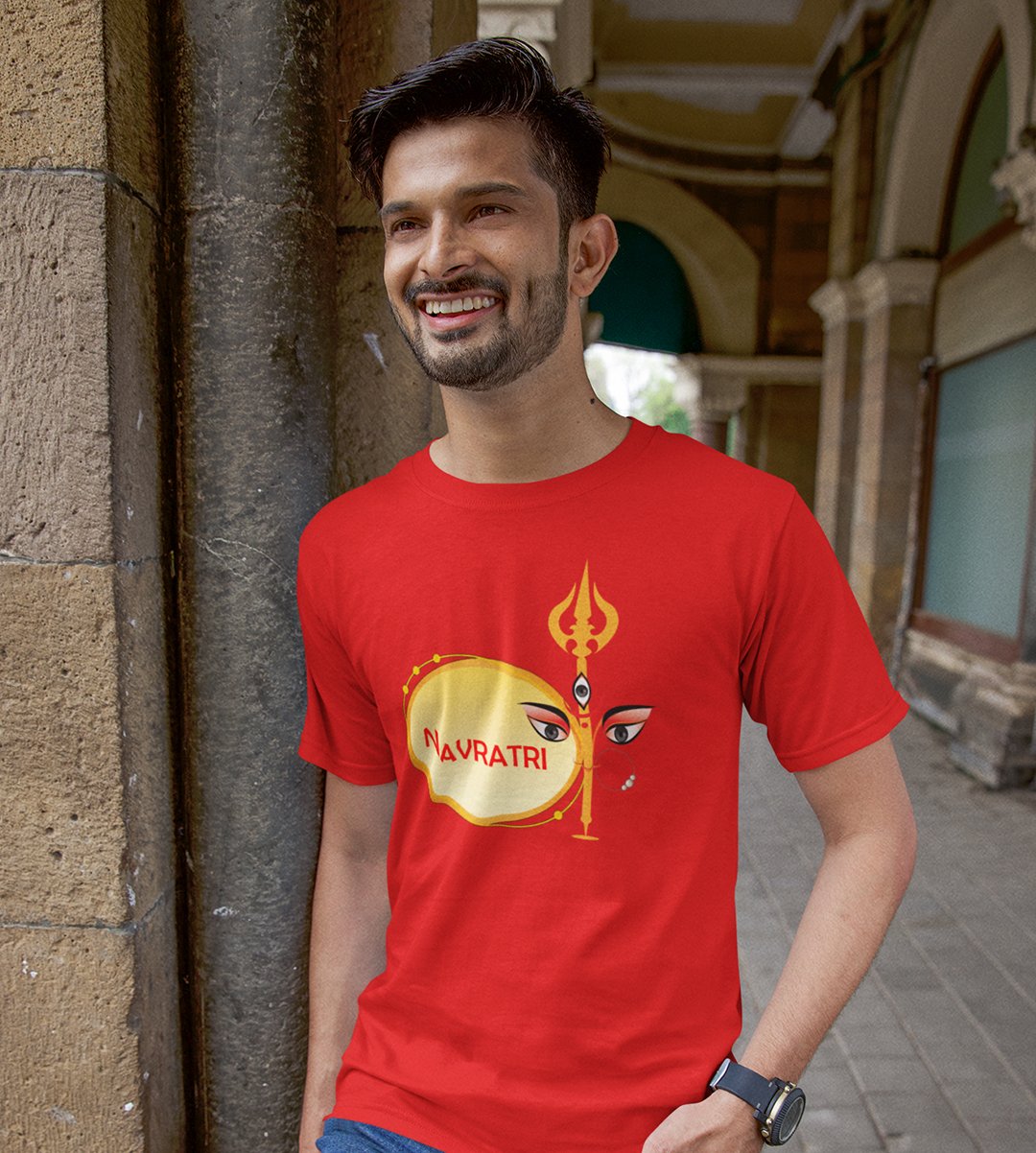 Navratri is a very auspicious festival for hindus. It takes place at the beginning of October and sometimes September. Enjoy the 9 days of festivities with full zeal and make yourself submerged in the love of Maa Durga. Navratri is also known as Durga Puja. And with this Tees, you can shine like a star during this festive season with our navratri themed cotton half sleeved Tshirts. You can pair our t-shirts with trousers and denim of your choice and make it a weekday smart casual or weekend wear. This is durable. This tshirt is smooth and soft which makes you comfortable to wear during all seasons. The printing in it is durable and odourless. It has five sizes, S,M,L,XL,XXL. The Tshirt colour is intact even after repeated washes. It can be kept in your wardrobe and hangers. Please avoid washing mashine to clean this Tee, it may affect the print. Hand wash only. We have brought you many navratri related designs printed on our different colour Tshirts to choose from. Grab it now.