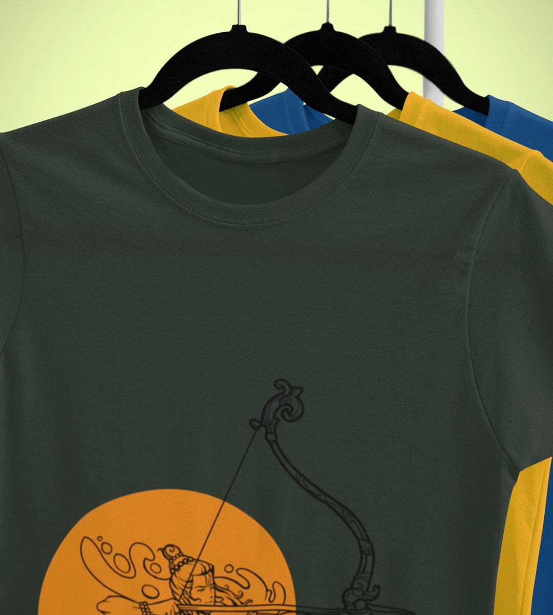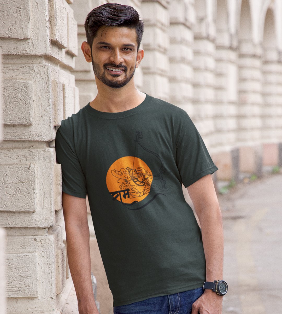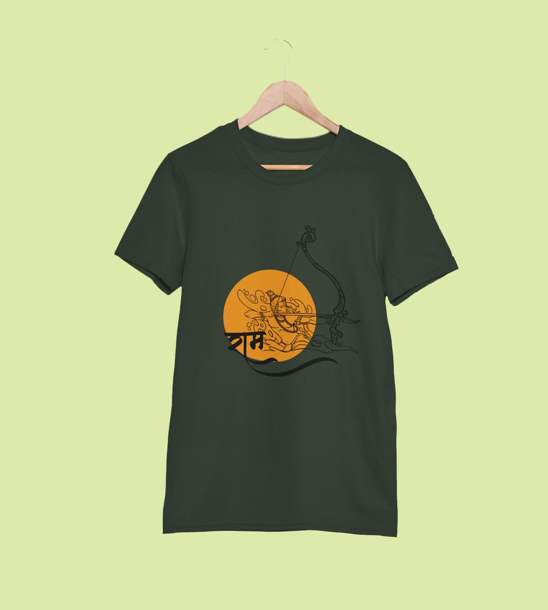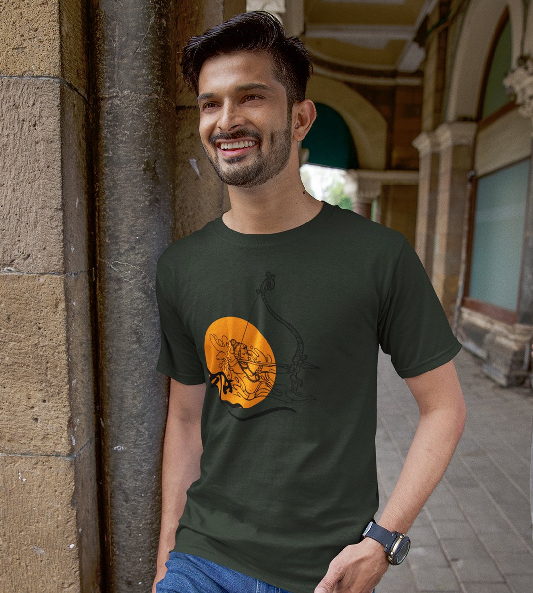 Orange circle based Ram text printed unisex adults round neck cotton half-sleeve green tshirt specially for Navratri festival/ Durga puja