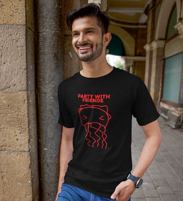 Party With Friends Black Round Neck Cotton Half Sleeved Men T Shirt with Printed Graphics