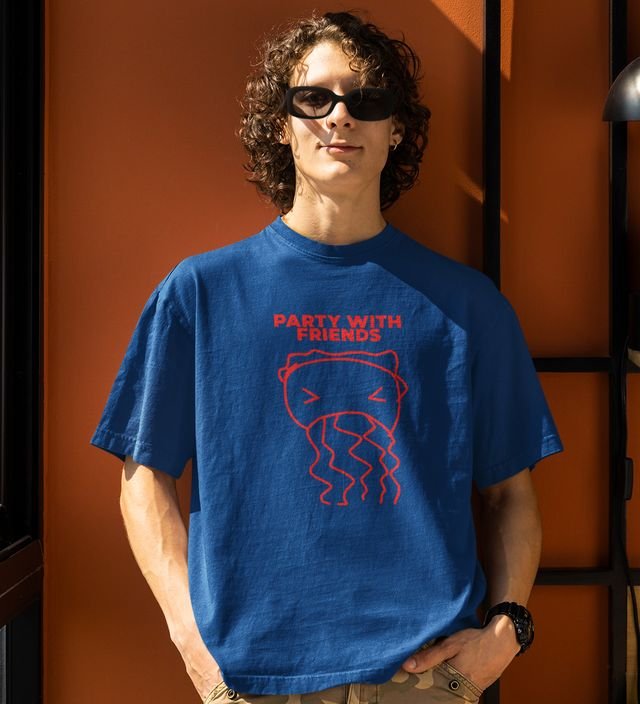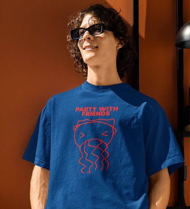 Party With Friends Blue Round Neck Cotton Half Sleeved Men T Shirt with Printed Graphics