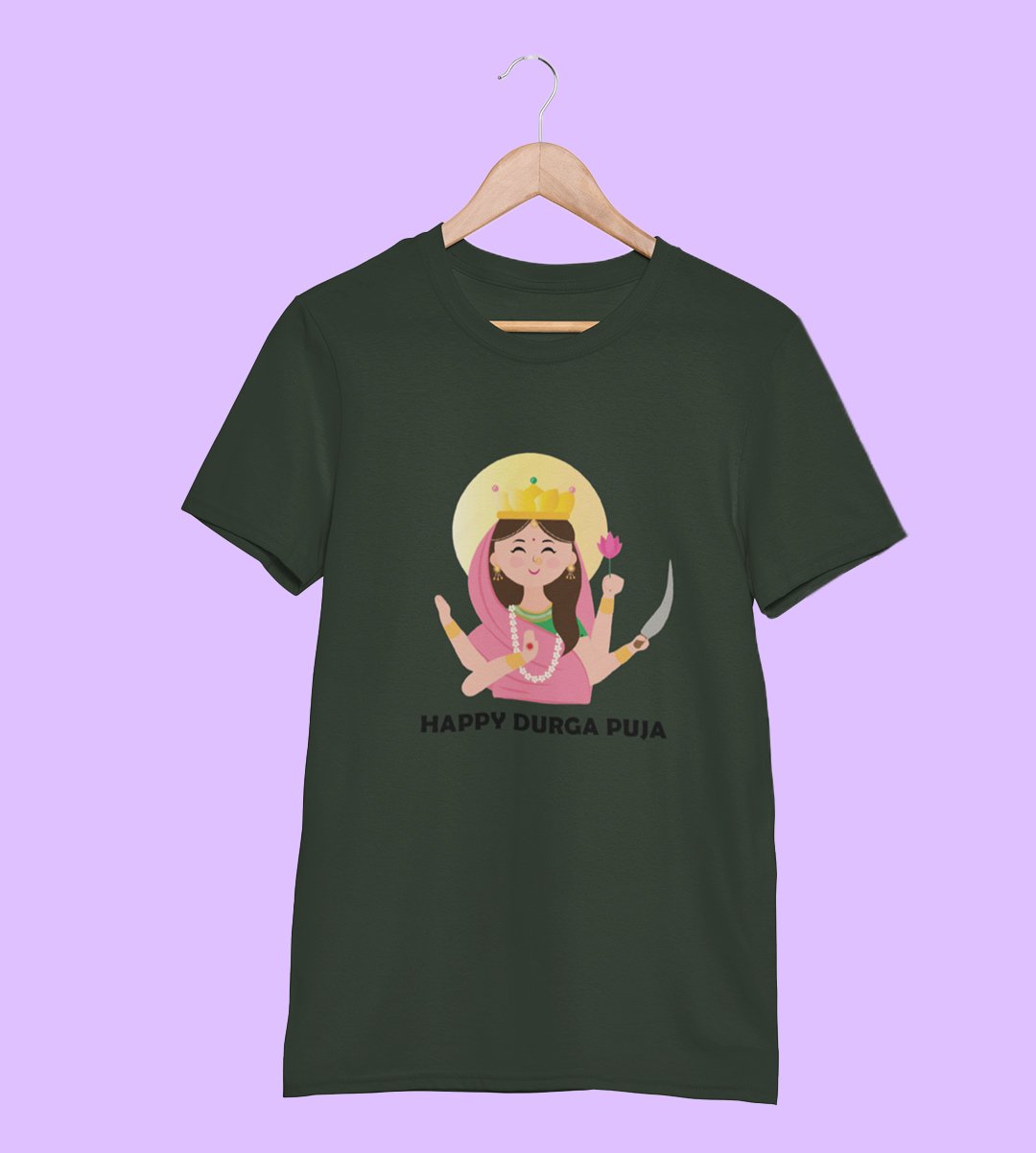 Pink saree dressup durga maa printed unisex adults round neck cotton half-sleeve green tshirt specially for Navratri festival/ Durga puja