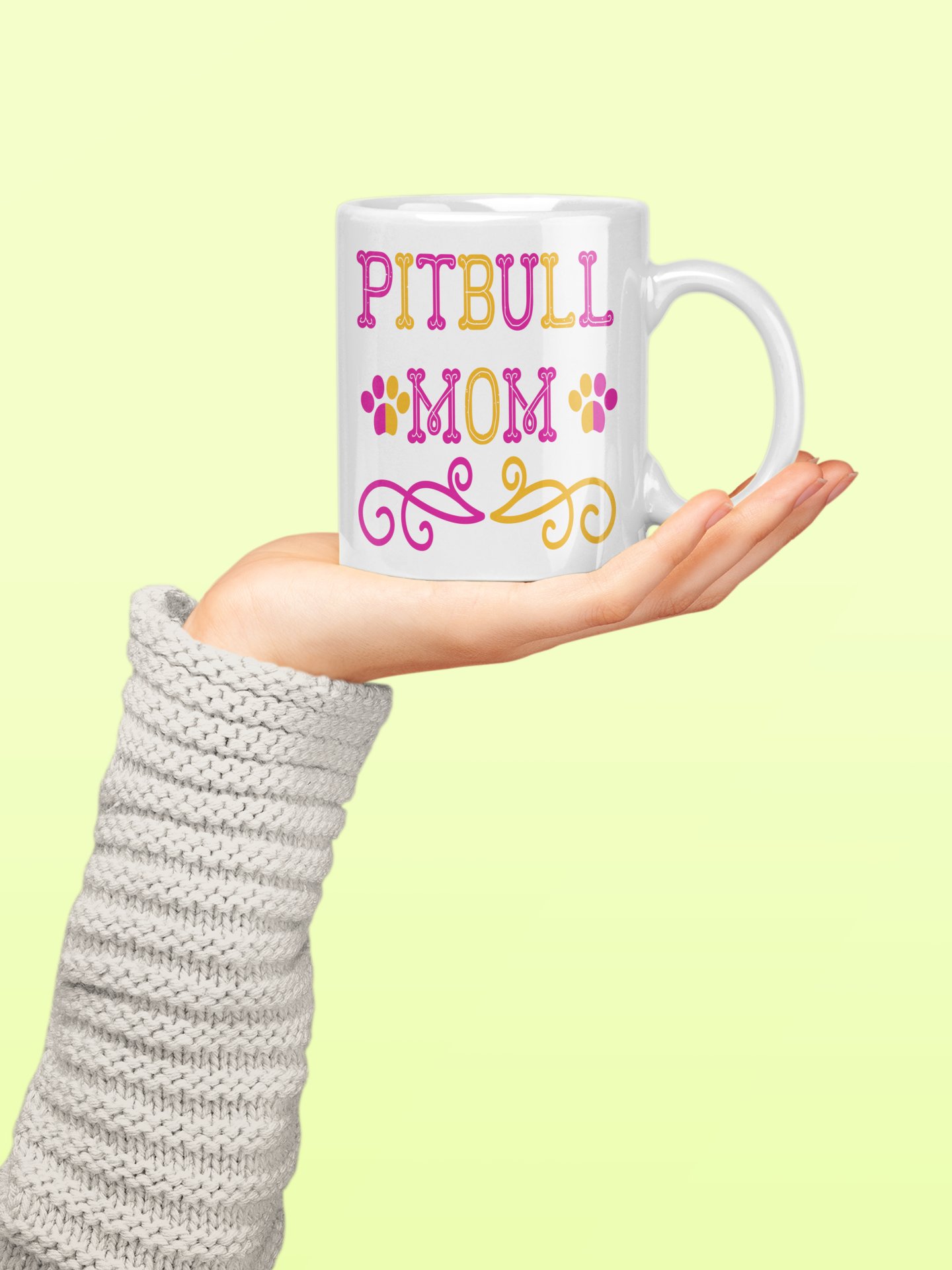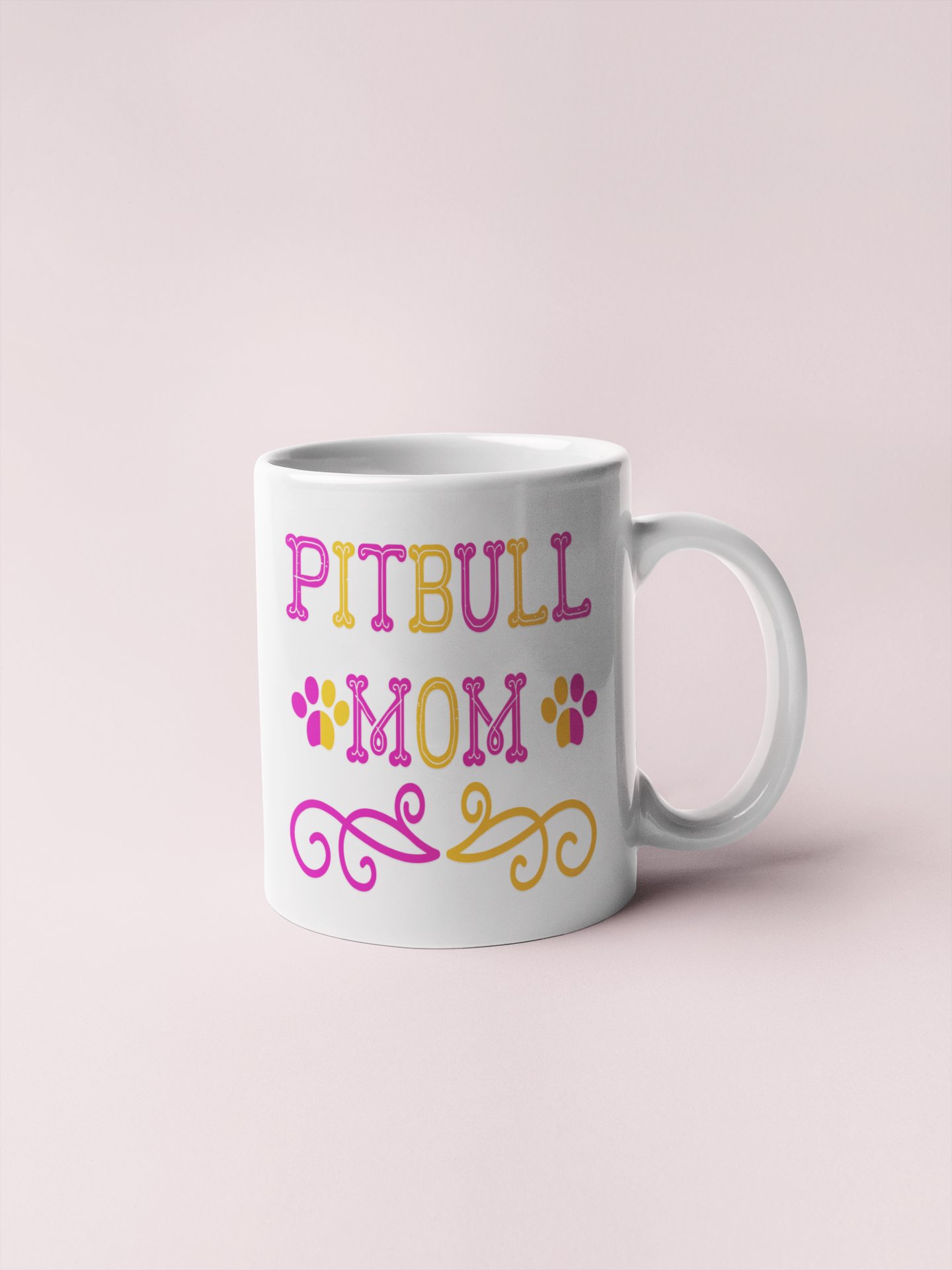 Pitbull Mom Yellow And Pink Text - pets themed printed ceramic white coffee and tea mugs/ cups for pets lover people