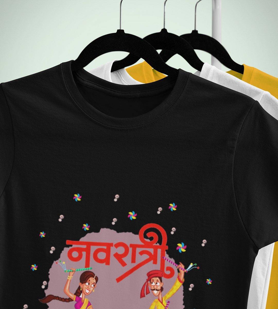 Navratri is a very auspicious festival for hindus. It takes place at the beginning of October and sometimes September. Enjoy the 9 days of festivities with full zeal and make yourself submerged in the love of Maa Durga. Navratri is also known as Durga Puja. And with this Tees, you can shine like a star during this festive season with our navratri themed cotton half sleeved Tshirts. You can pair our t-shirts with trousers and denim of your choice and make it a weekday smart casual or weekend wear. This is durable. This tshirt is smooth and soft which makes you comfortable to wear during all seasons. The printing in it is durable and odourless. It has five sizes, S,M,L,XL,XXL. The Tshirt colour is intact even after repeated washes. It can be kept in your wardrobe and hangers. Please avoid washing mashine to clean this Tee, it may affect the print. Hand wash only. We have brought you many navratri related designs printed on our different colour Tshirts to choose from. Grab it now.