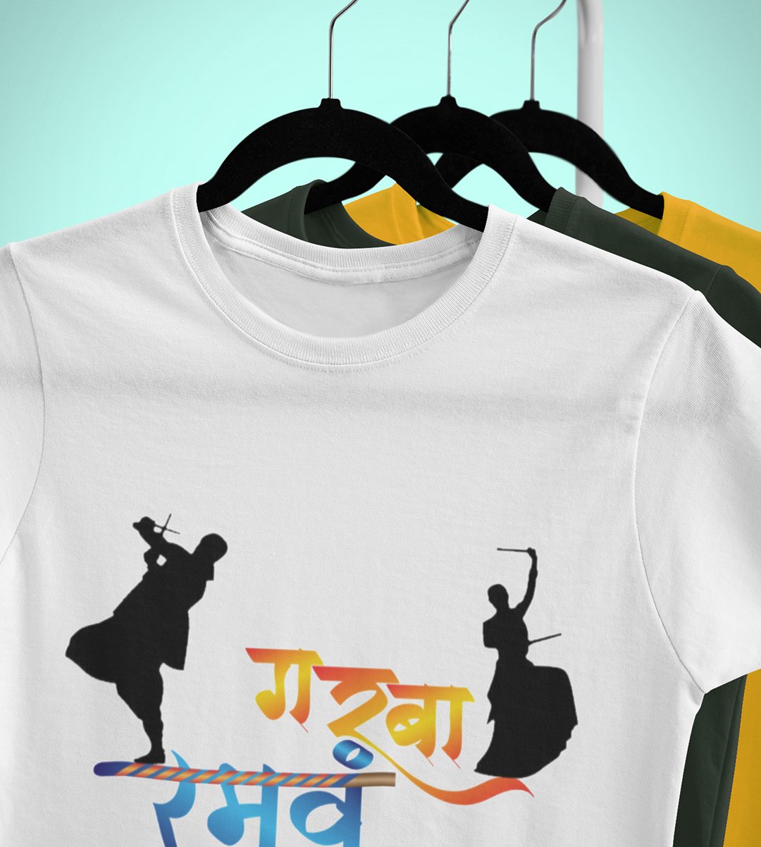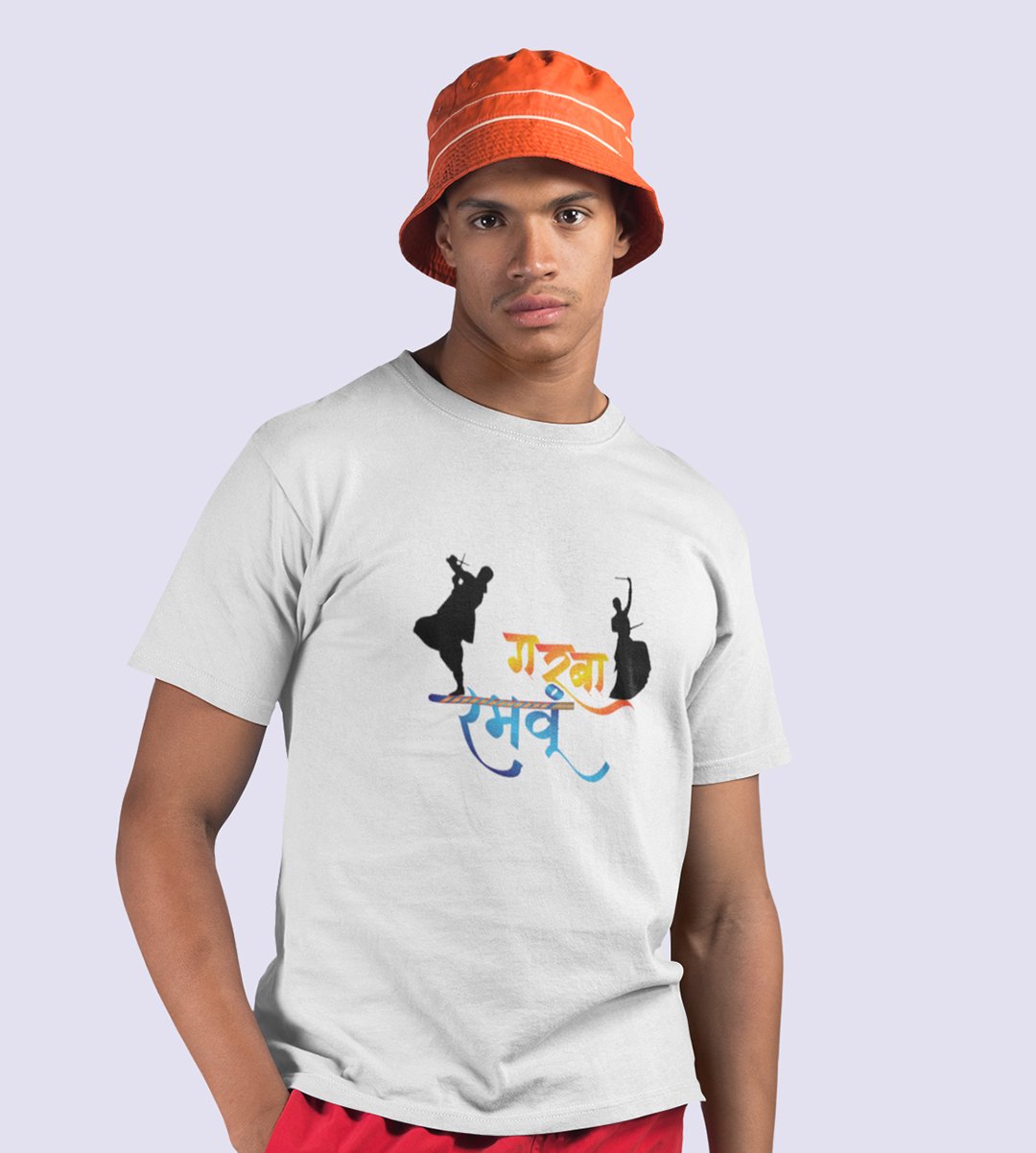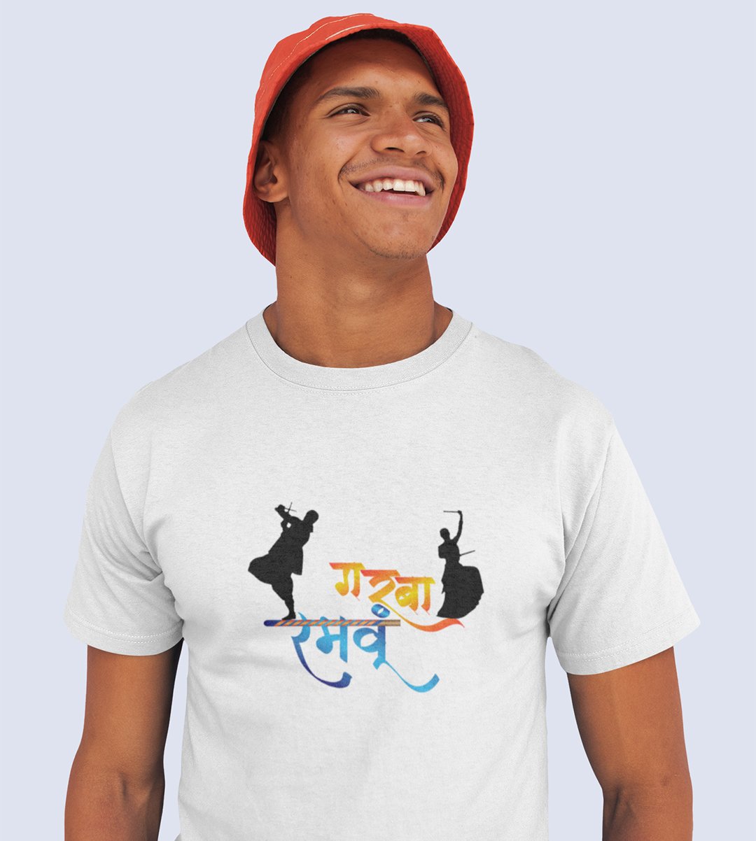 Playing Garba printed unisex adults round neck cotton half-sleeve white tshirt specially for Navratri festival/ Durga puja