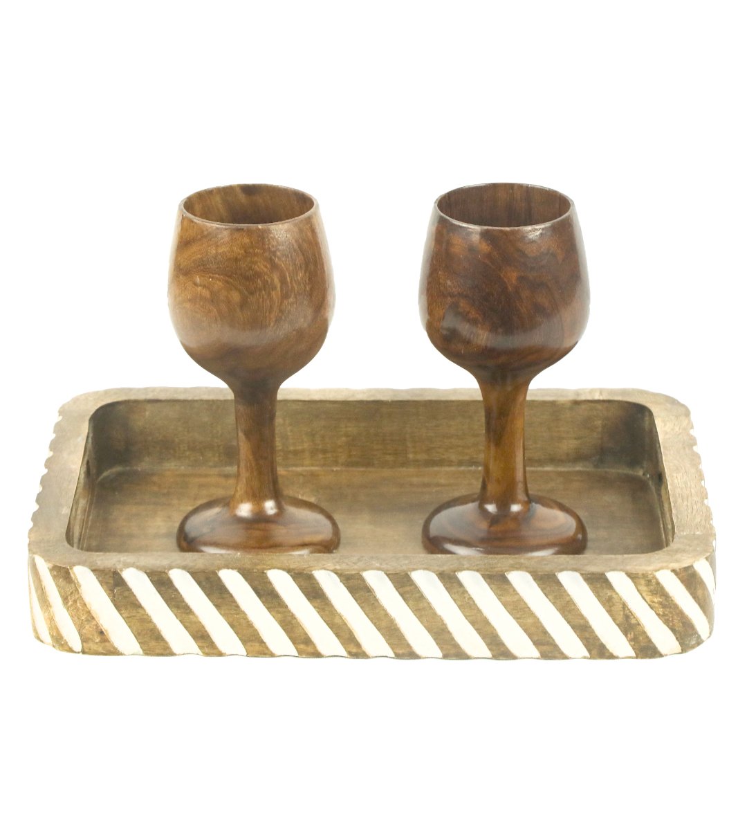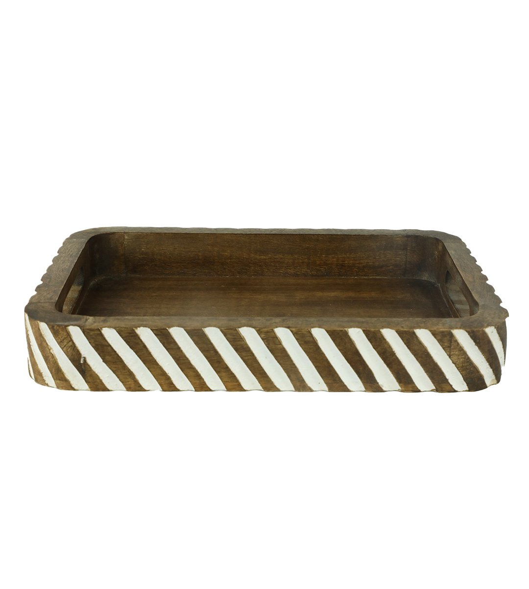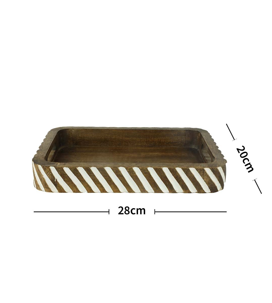 White striped wooden rectangular serving tray / food serving plate. These items are used to serve tea or coffee or some kind of starter food to the guests. It has concentric art and delightful detailing which adds extra captivating look to the product. It is made up of wood with fine completion. It is used in kitchens, restaurents, bars etc. Finest gifting material to your friends, family, relatives or dear ones. Everyone has their favourite one to choose from. It looks good in transparent cupboards, or in kitchens, dining room or bedroom's side tables. We have brought you many wooden and stylish trays of different designs. Grab it now. Avoid using wet cloth to wipe this item for better use. Add an element of beauty to your home decor. It could be a memorable gift for birthdays, marriage parties, house warming, anniversary etc, it can be a memorable return gift. What can be a better gift than an unique wooden item for your loved ones?