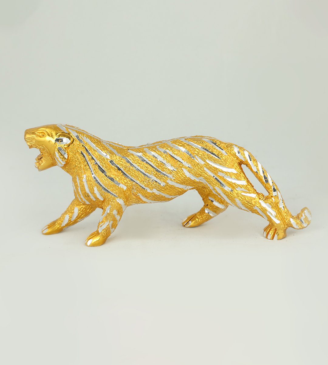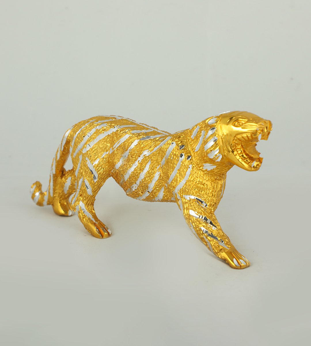 The golden tiger/ jaguar/ panther is made of special metal alloy which makes them very sturdy and durable. They are light weight and can be kept anywhere. Add an element of beauty to your home decor. It can also be an ideal addition to your living room, guest room, drawing room. It enhance the decor value of the temple, house, office, hotel, restaurent etc. It brings peace & happiness among the home members. It is very appealing and eye catching as a home decor item. It is used to keep in home's showpiece keeper, car's dashboard, receptionist's table etc  It could be a memorable gift to your wedding, house warming, anniversary or festive occasions, it can be a memorable return gift.What can be a better gift than a handcrafted antique metal statue for your loved ones? Gift it to yourself or Friend, Spouse, Mother, Father, Grand Parents. Beautifully handcrafted and ornamented tiger showpiece / statue, glows with golden glitters, made with glittery material. Keep this statue at your home and office for decoration. It's also a perfect gift for the people who loves to decorate their home.