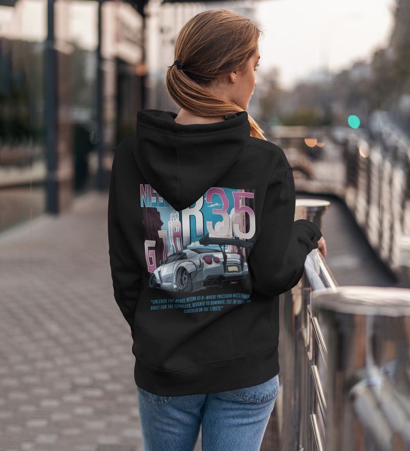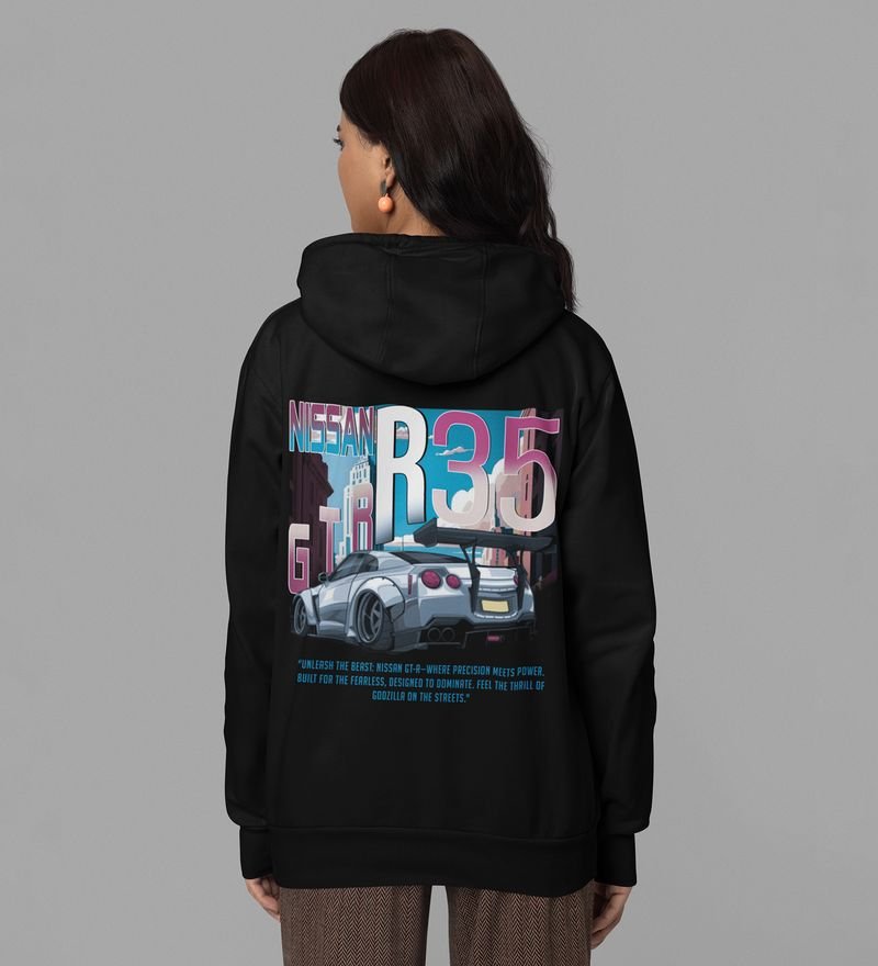 R35: Where Power Knows No Limits High-Performance Car Printed Black Hoodie for Women