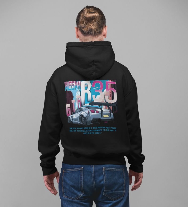 R35 Where Power Knows No Limits HighPerformance Car Printed Black Hoodie for Men