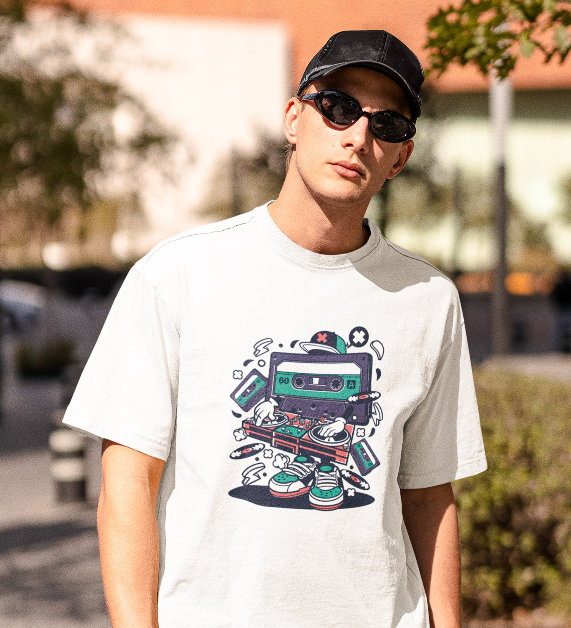 Vintage Casette Tape White Round Neck Cotton Half Sleeved Men's T-Shirt with Printed Graphics