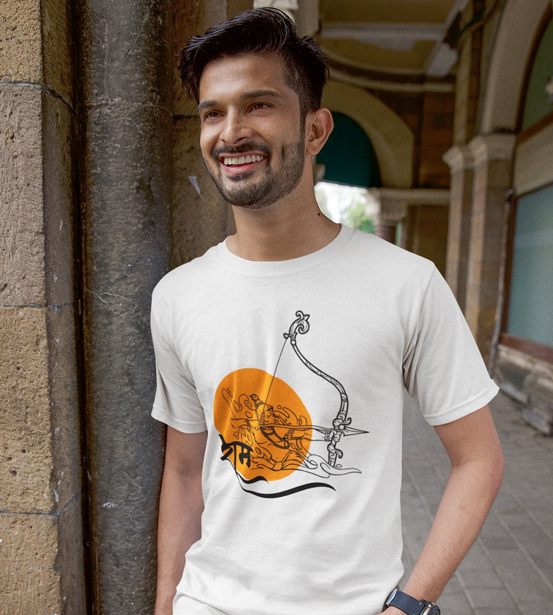 Ram and Crossbow (BG orange) printed unisex adults round neck cotton half-sleeve white tshirt specially for Navratri festival/ Durga puja