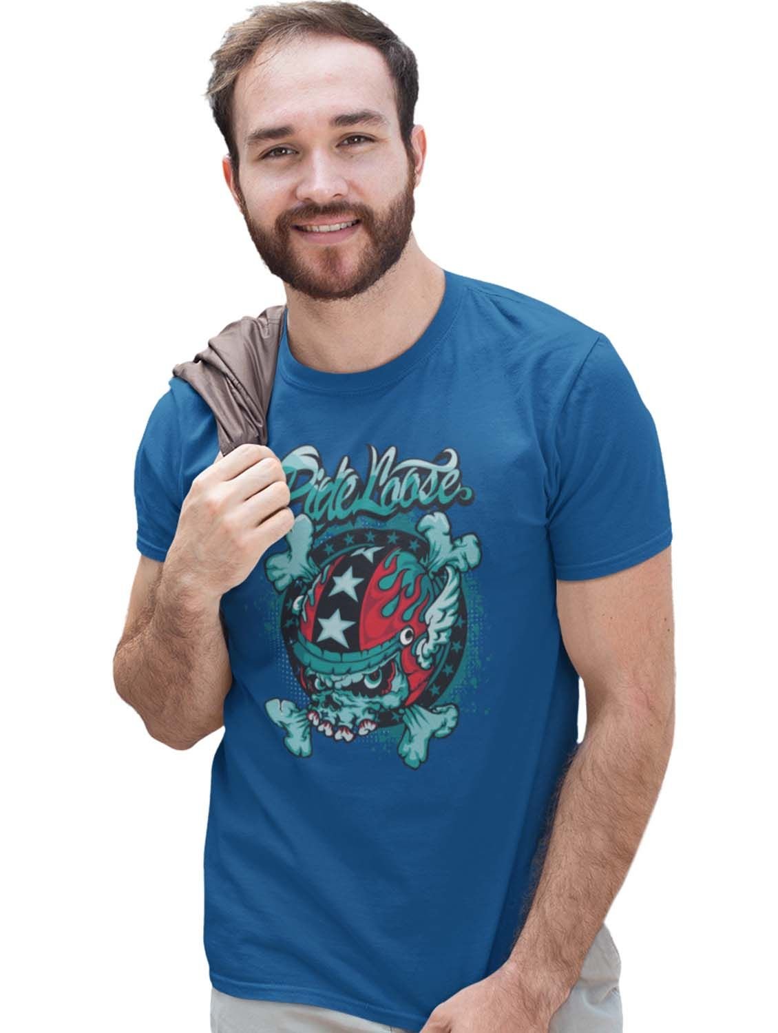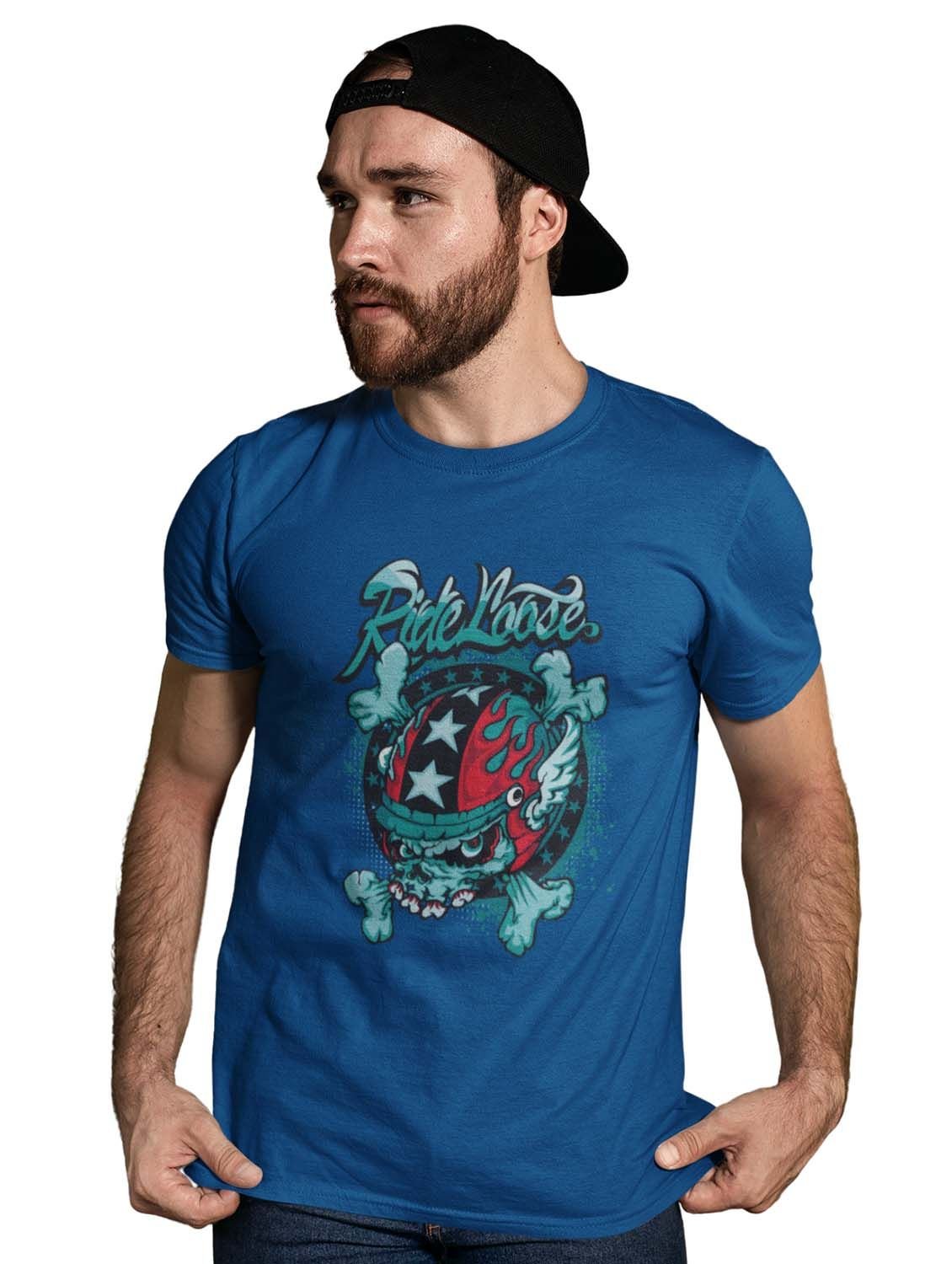 Ride Loose, (BG Yellow) Blue Round Neck Cotton Half Sleeved T-Shirt with Printed Graphics