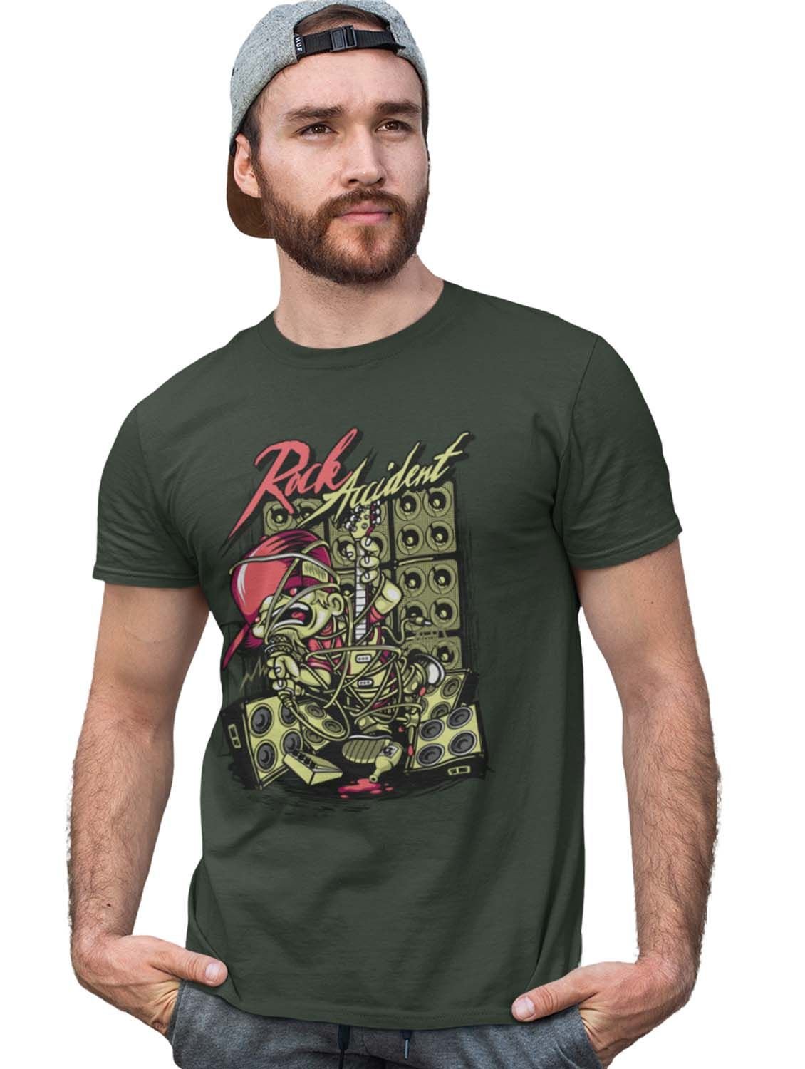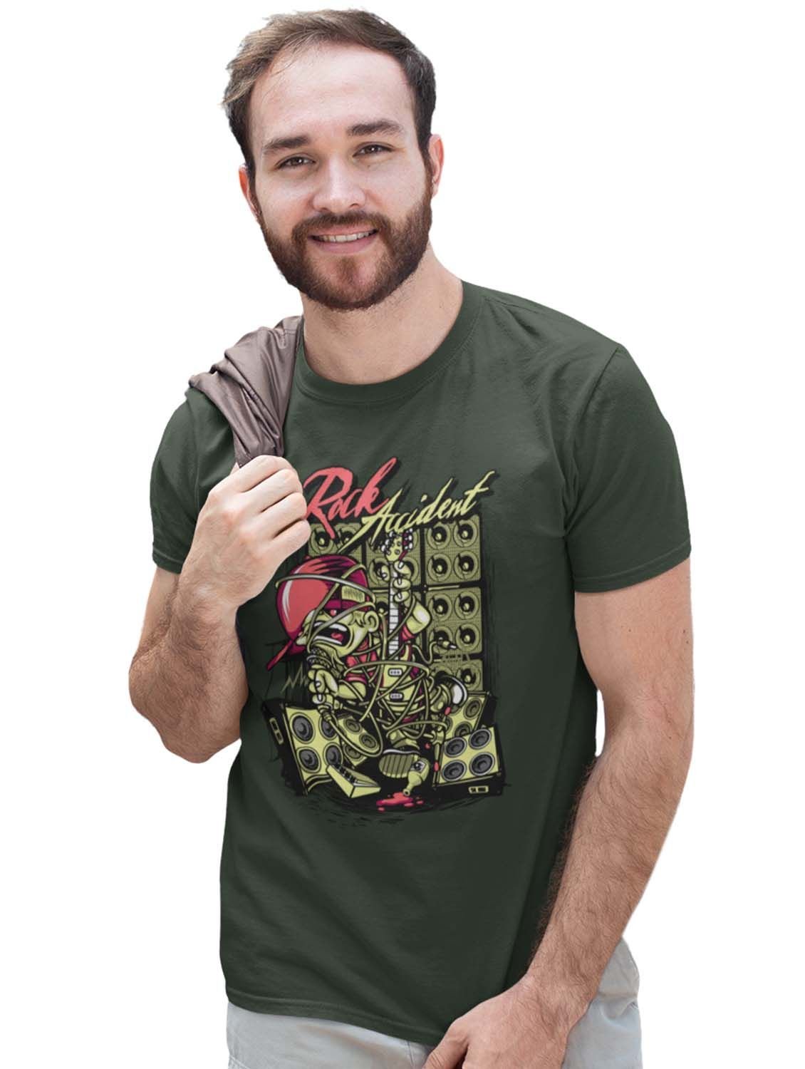 Rock Accident Green Round Neck Cotton Half Sleeved T-Shirt with Printed Graphics