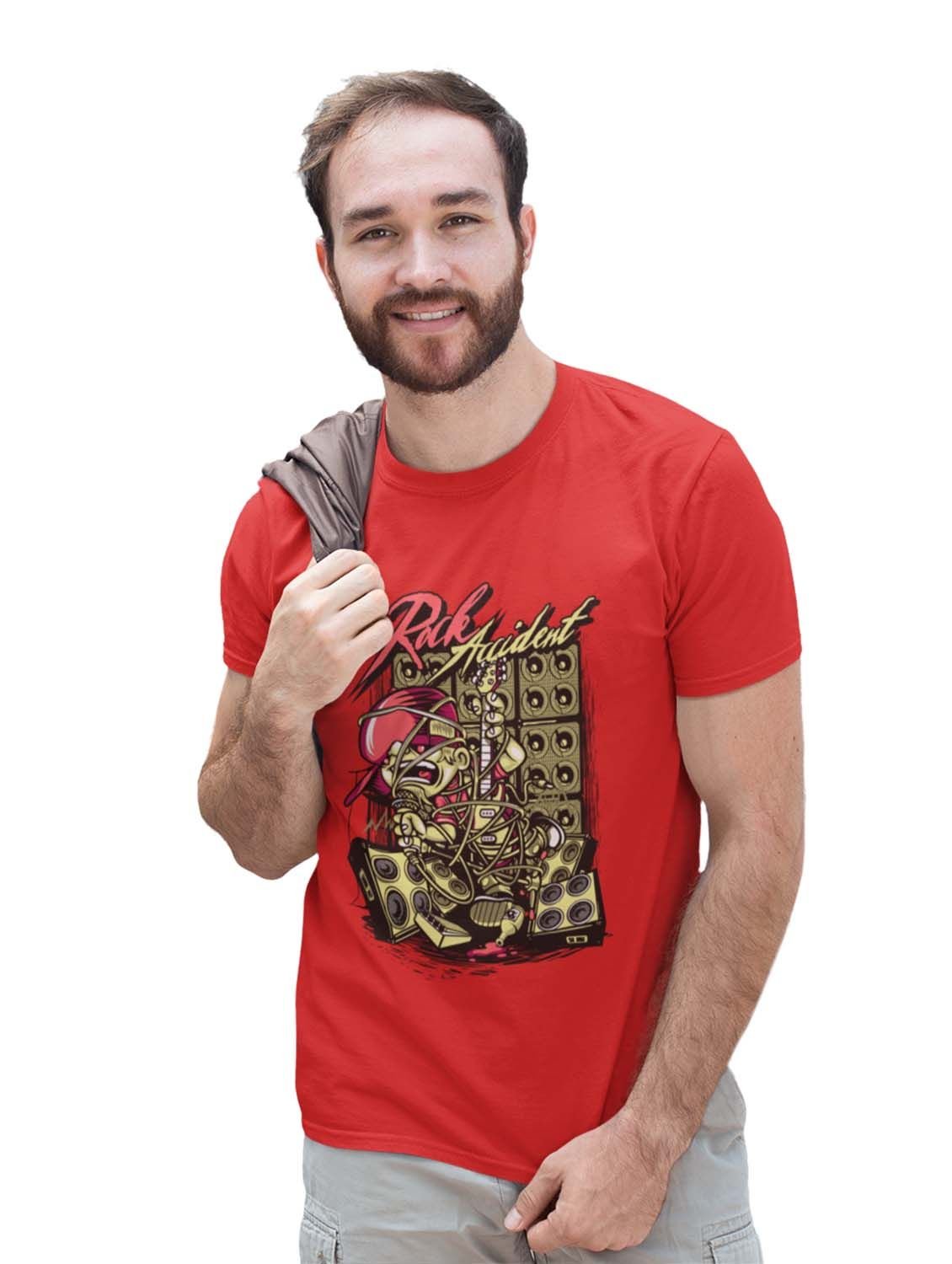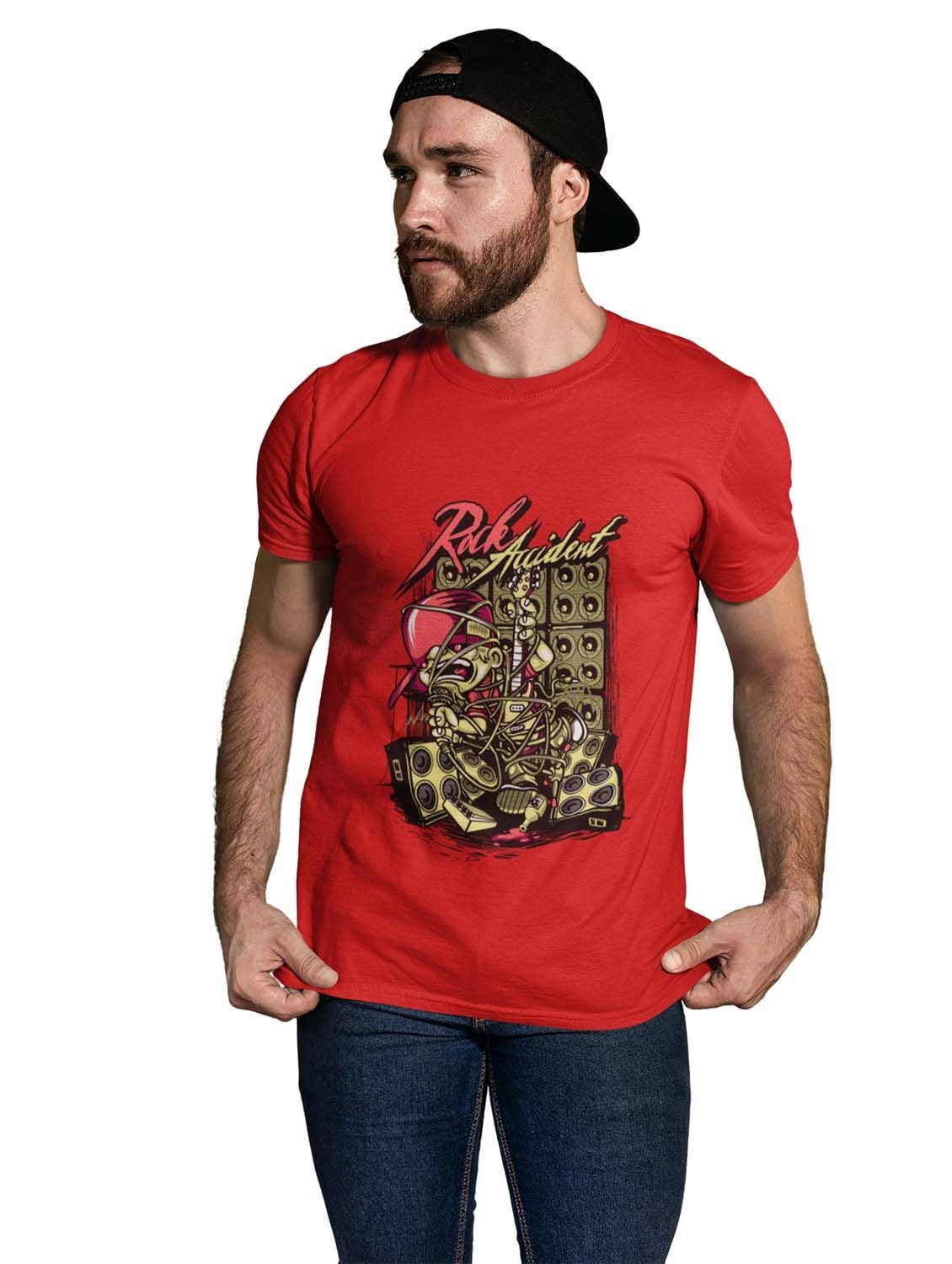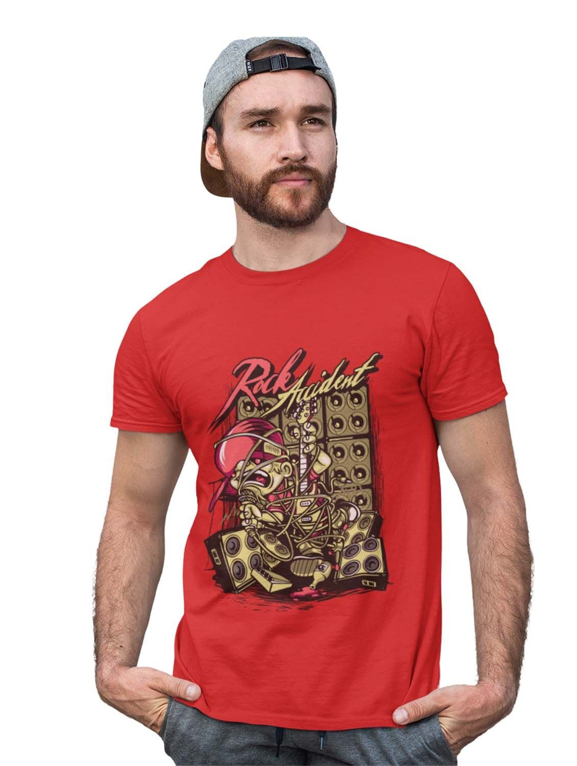 Rock Accident Red Round Neck Cotton Half Sleeved T-Shirt with Printed Graphics