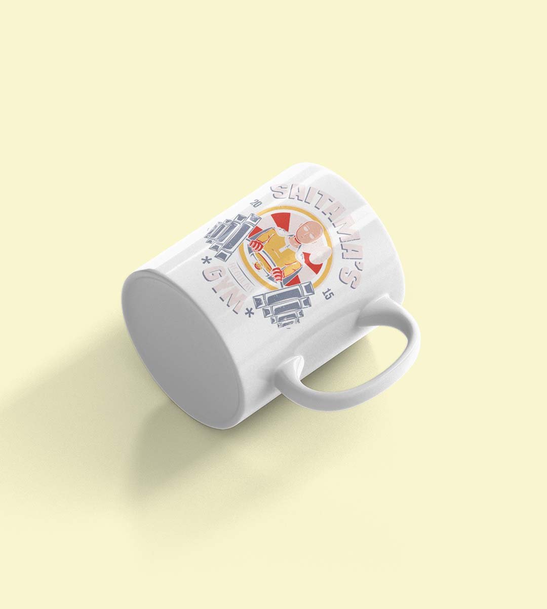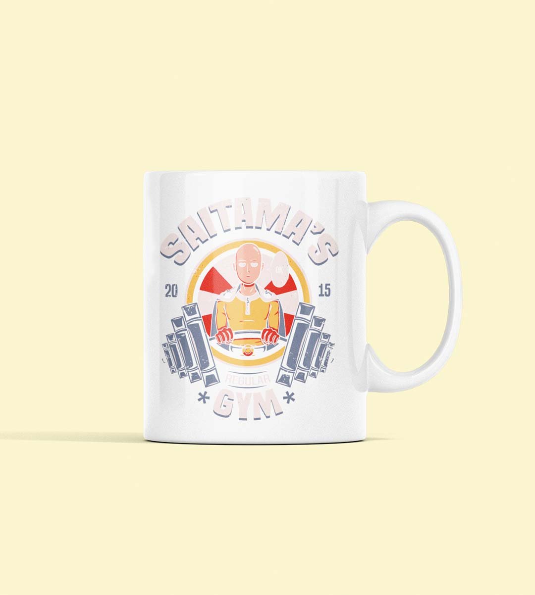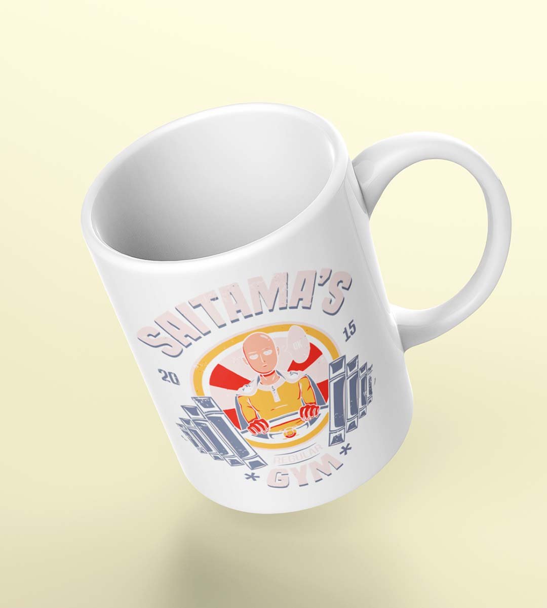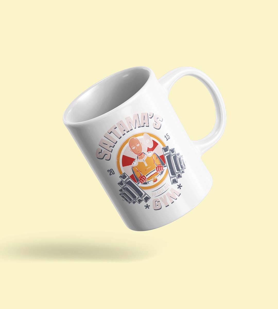 Saitama's regular gym - animation themed printed ceramic white coffee and tea mugs/ cups for animation lovers