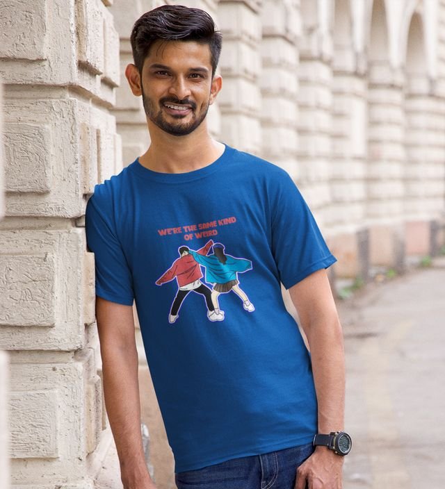 Same Kind Of Wierd Blue Round Neck Cotton Half Sleeved Men T Shirt with Printed Graphics