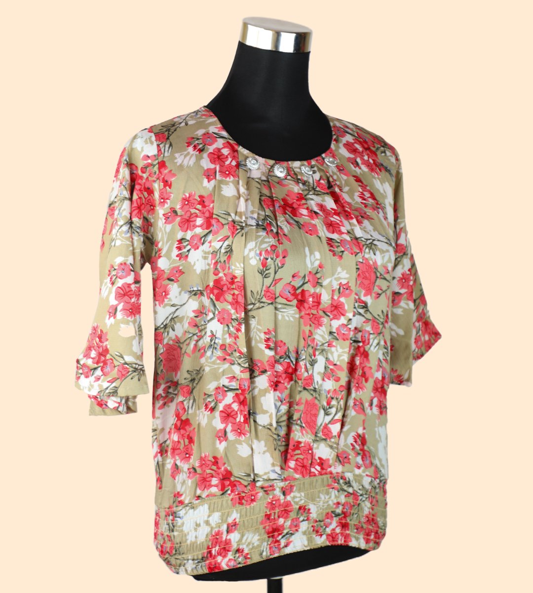 Embrace elegance with our Women's Sand Top adorned with charming Red Floral Accents. This top features a classic round neck design and a regular fit, making it ideal for various occasions. Crafted from soft Rayon fabric, it combines style and comfort. The Red Floral Accents add a touch of sophistication and charm to your look.