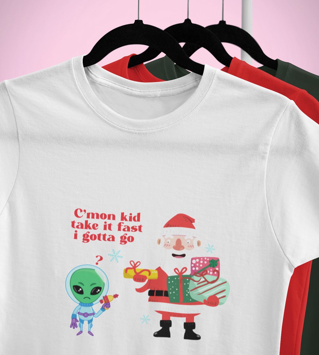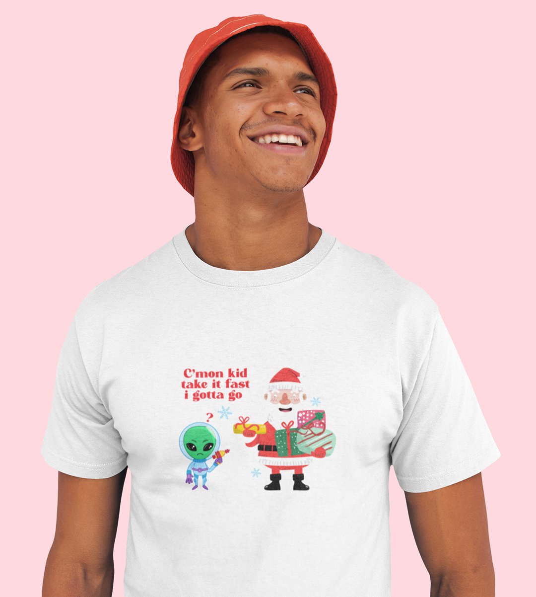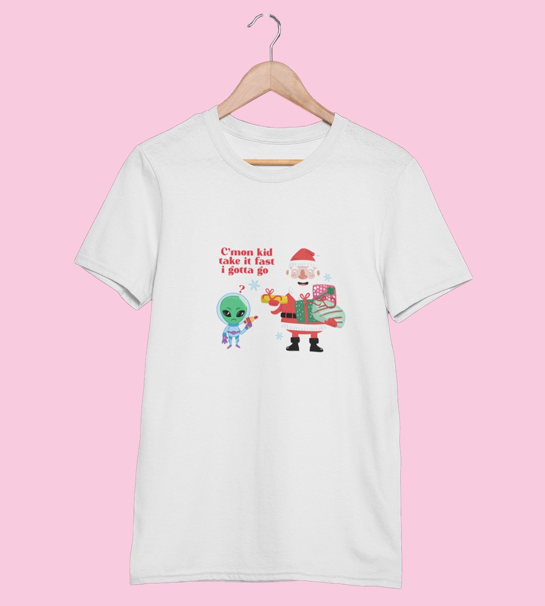 Santa And Alien's Talk : Elegantly Printed T-shirt (White) Best Gift For Boys Girls