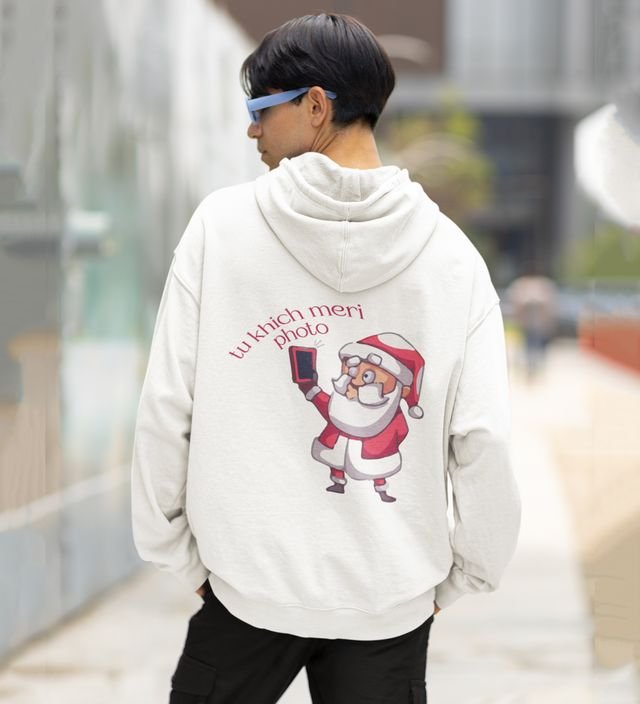 Santa Claus Cheerfully Taking a Selfie and Spreading Holiday Cheer Printed White Cotton Hoodie