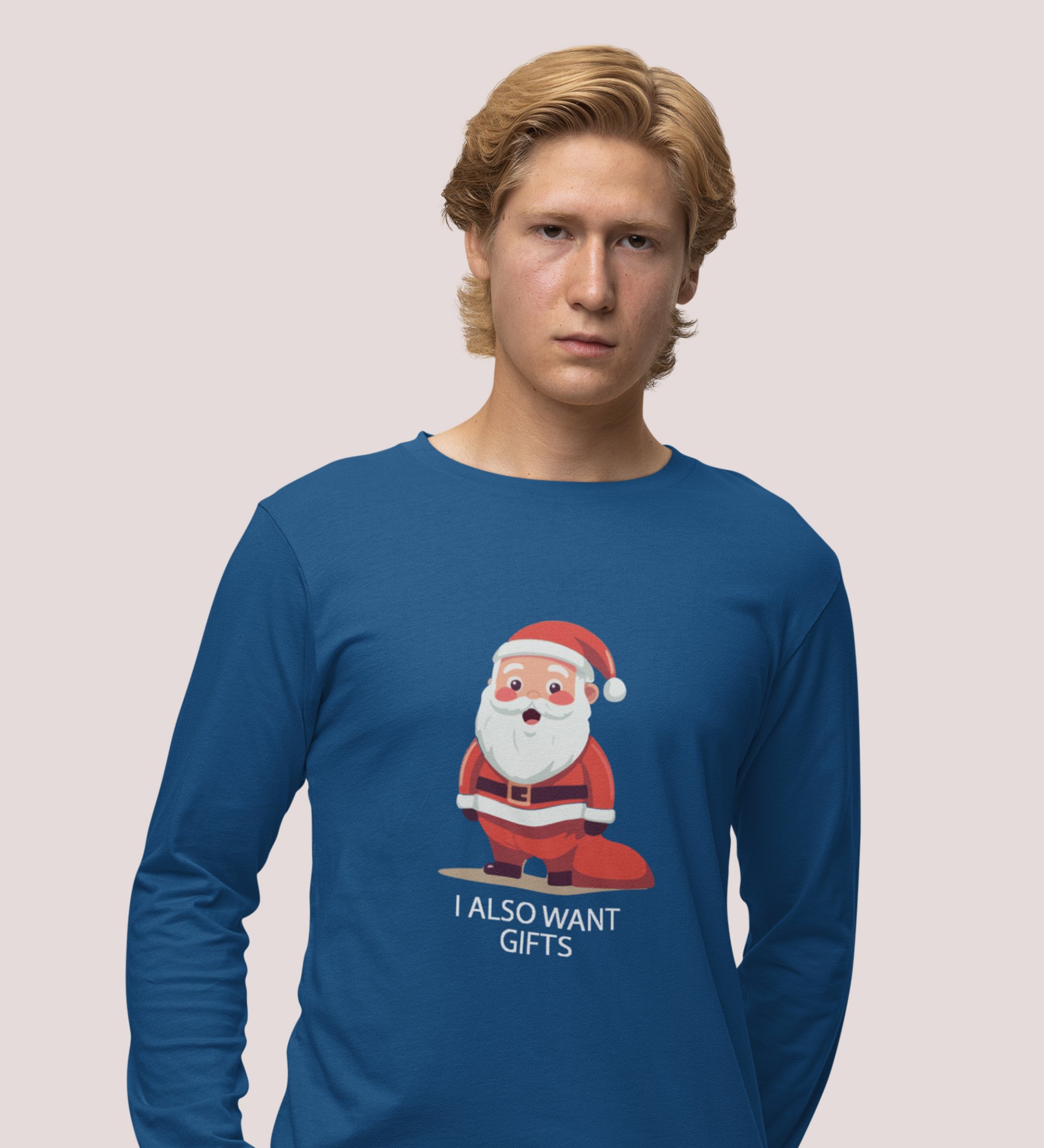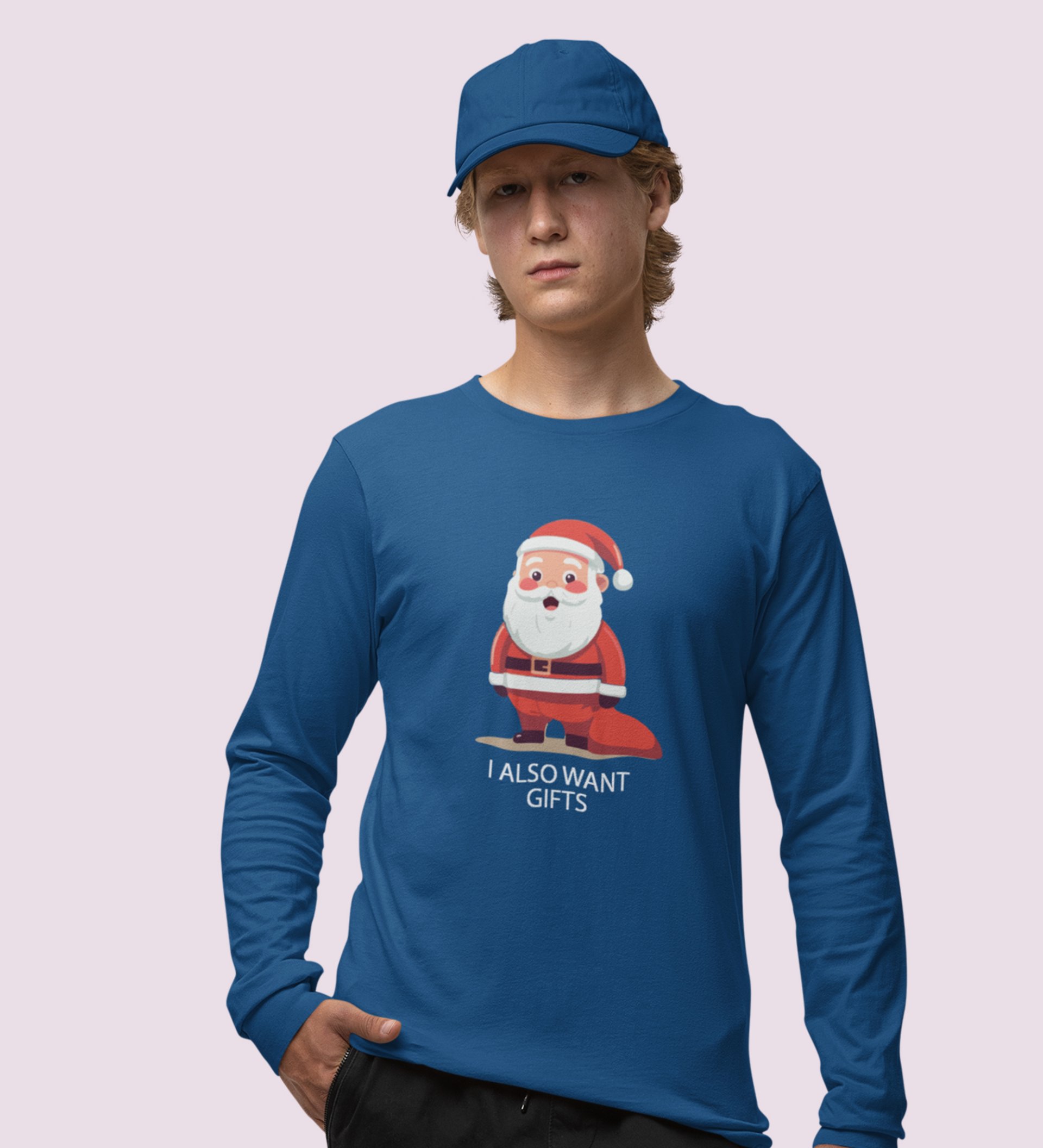 Santa Is Waiting For Gifts: Best DesignerFull Sleeve T-shirt Blue Unique Gifts For Secret Santa