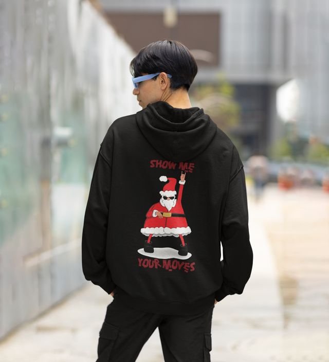 Santa Showing Off Dance Moves with Enthusiasm and Energy Printed Black Cotton Hoodie