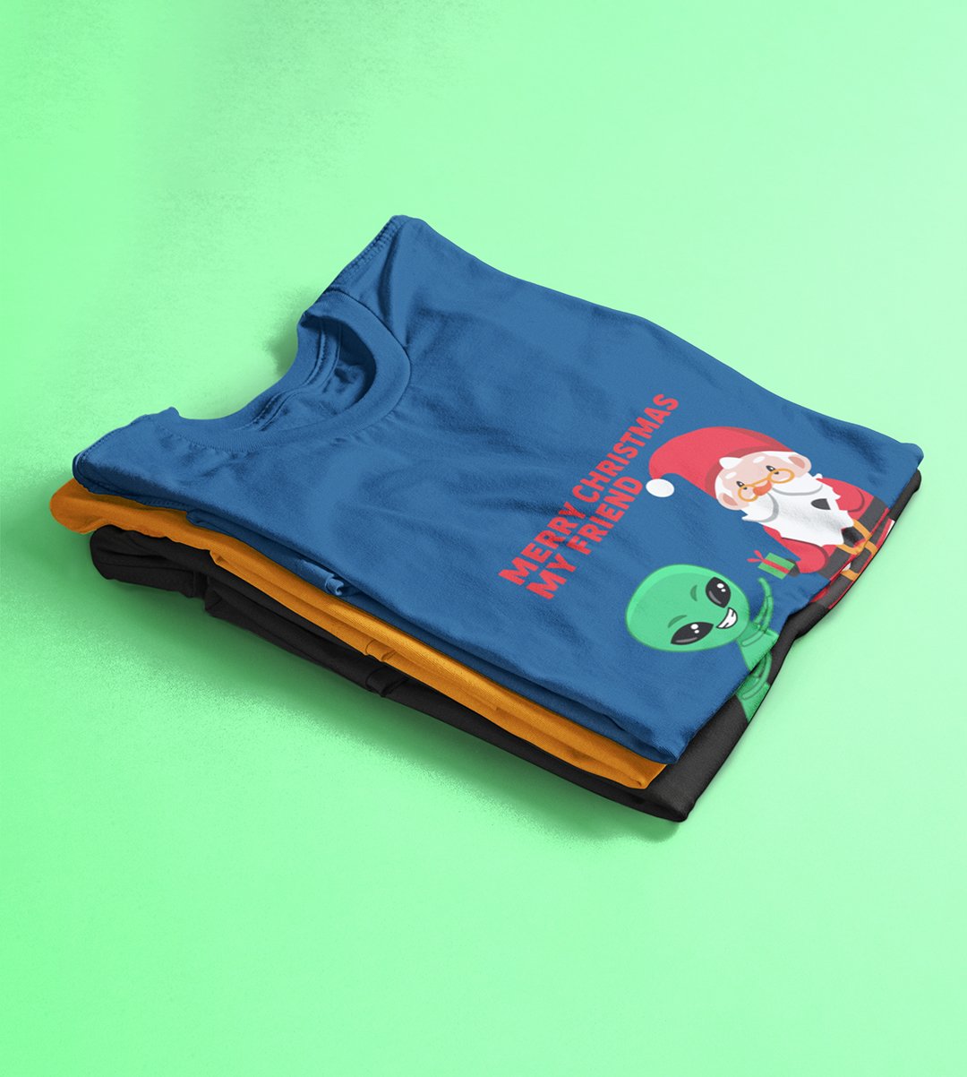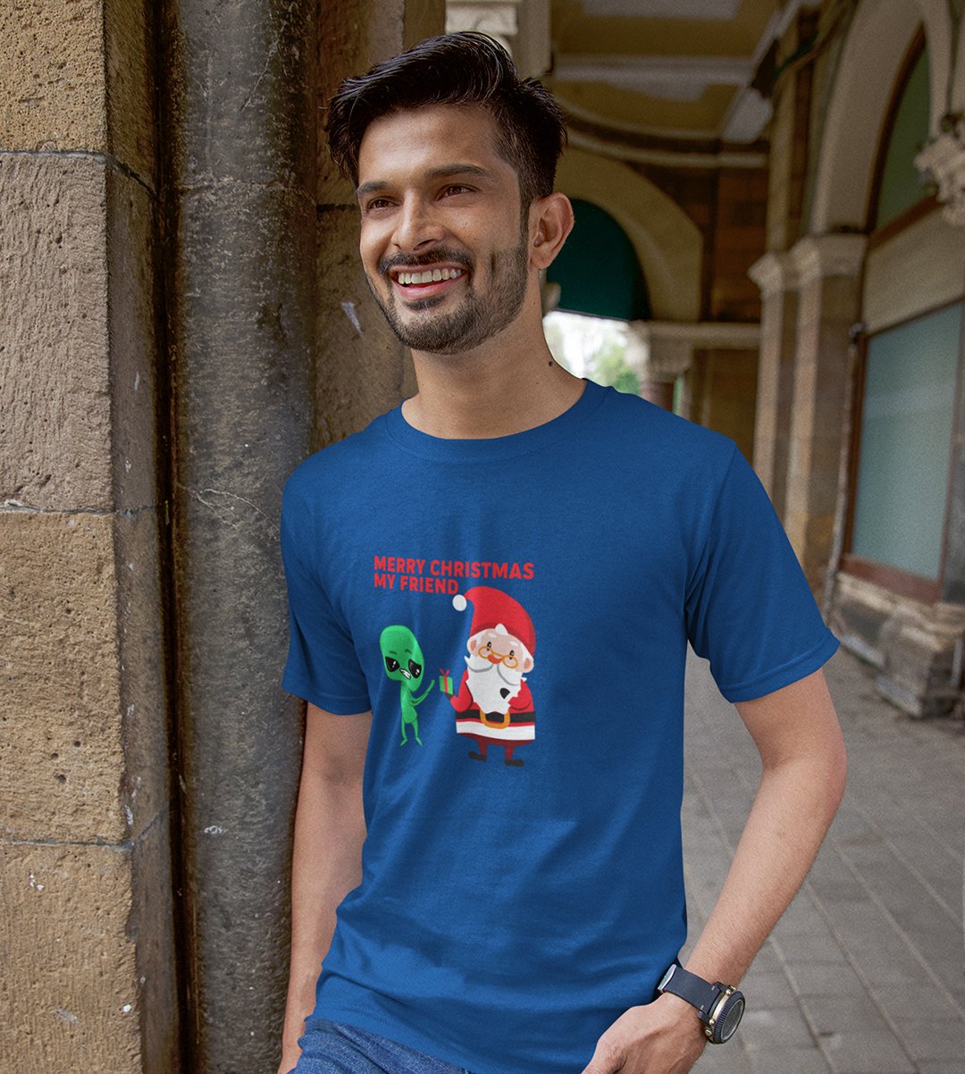 Santa With His Friend : Most Uniquely Printed T-shirt (Blue) Best Gift For Boys Girls
