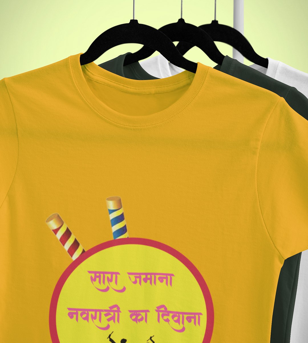 Navratri is a very auspicious festival for hindus. It takes place at the beginning of October and sometimes September. Enjoy the 9 days of festivities with full zeal and make yourself submerged in the love of Maa Durga. Navratri is also known as Durga Puja. And with this Tees, you can shine like a star during this festive season with our navratri themed cotton half sleeved Tshirts. You can pair our t-shirts with trousers and denim of your choice and make it a weekday smart casual or weekend wear. This is durable. This tshirt is smooth and soft which makes you comfortable to wear during all seasons. The printing in it is durable and odourless. It has five sizes, S,M,L,XL,XXL. The Tshirt colour is intact even after repeated washes. It can be kept in your wardrobe and hangers. Please avoid washing mashine to clean this Tee, it may affect the print. Hand wash only. We have brought you many navratri related designs printed on our different colour Tshirts to choose from. Grab it now.