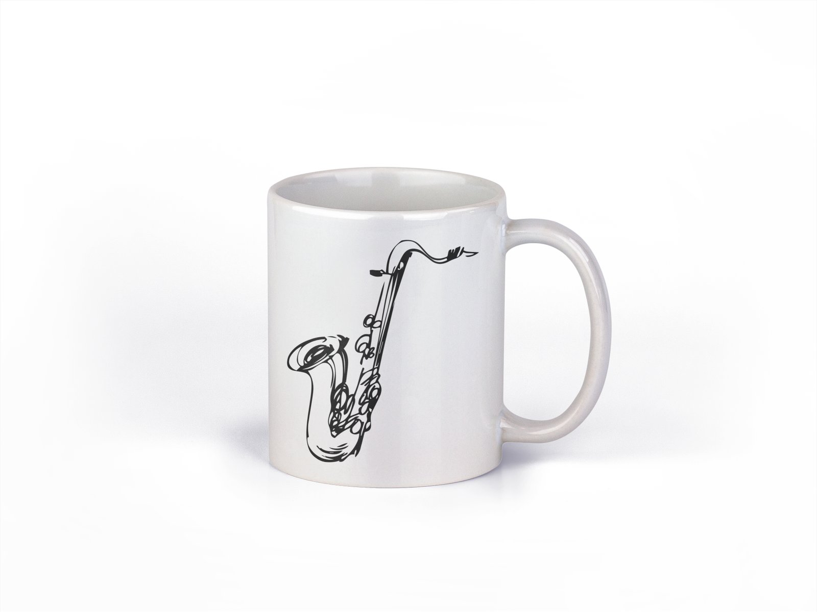 Black Sexaphone- music themed printed ceramic white coffee and tea mugs/ cups for music lovers