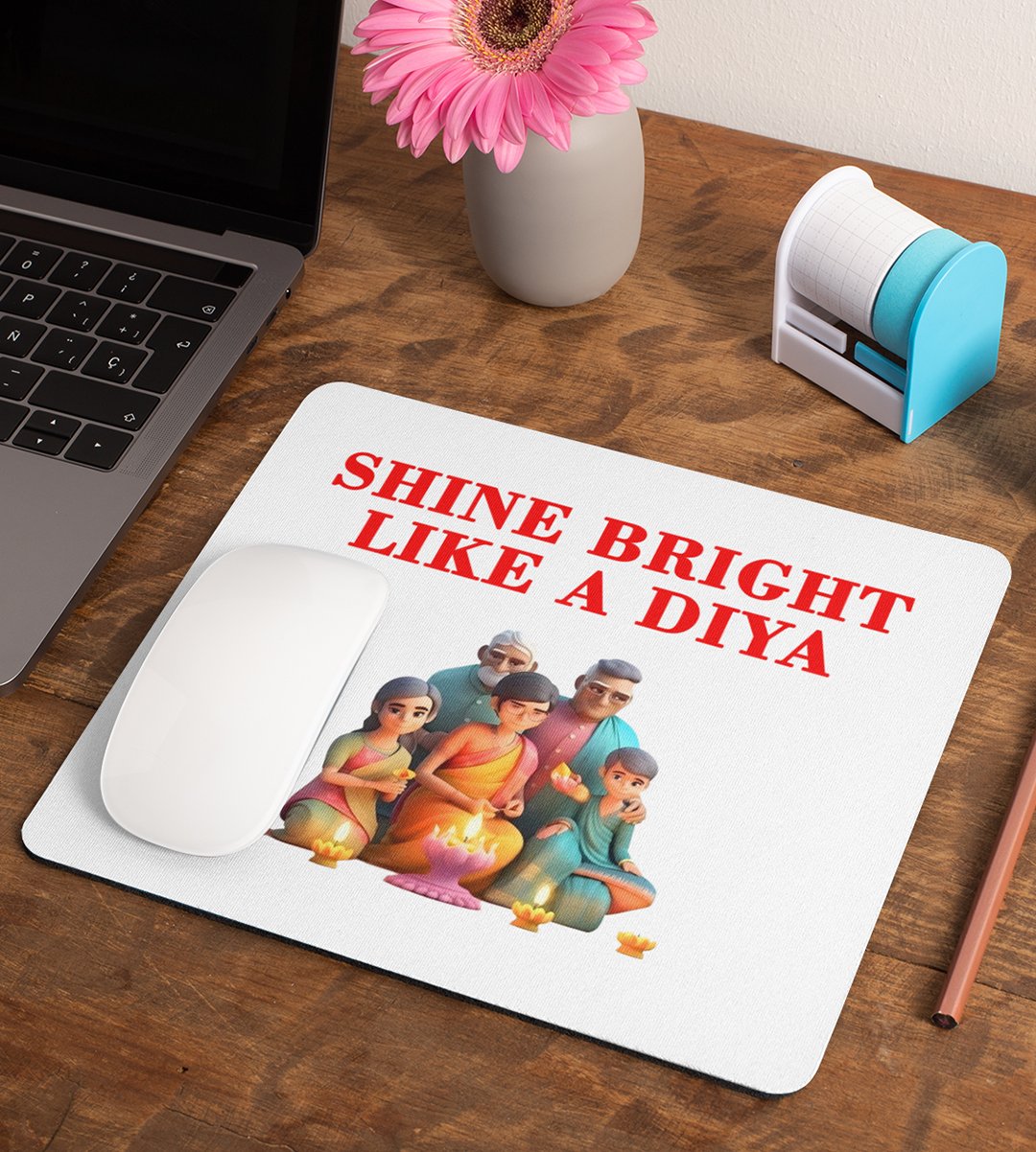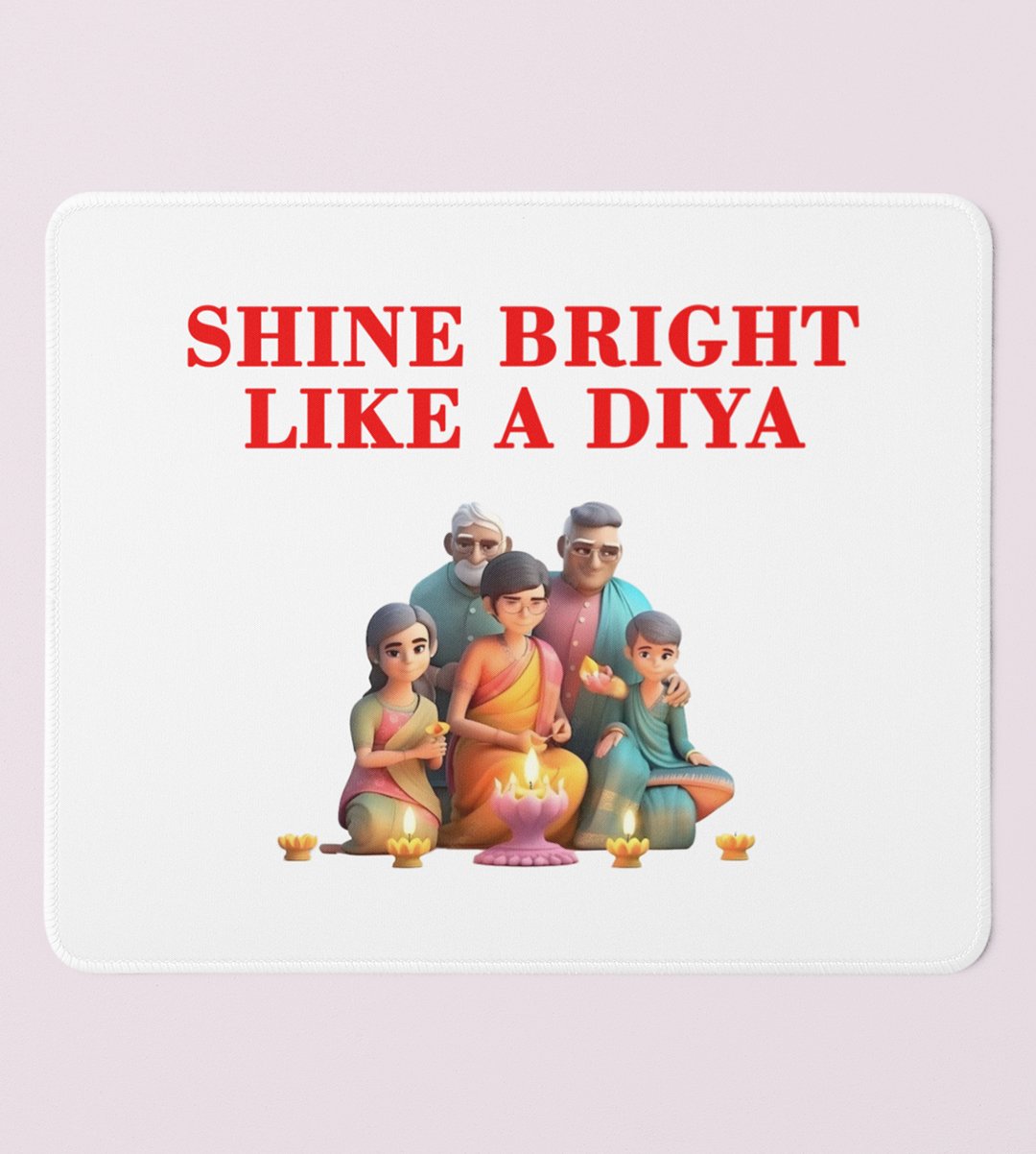 Elevate your workspace with the heartwarming depiction of family celebrating Diwali in our Shine Bright Like A Diya Mouse Pad. It's all about togetherness and festivity.