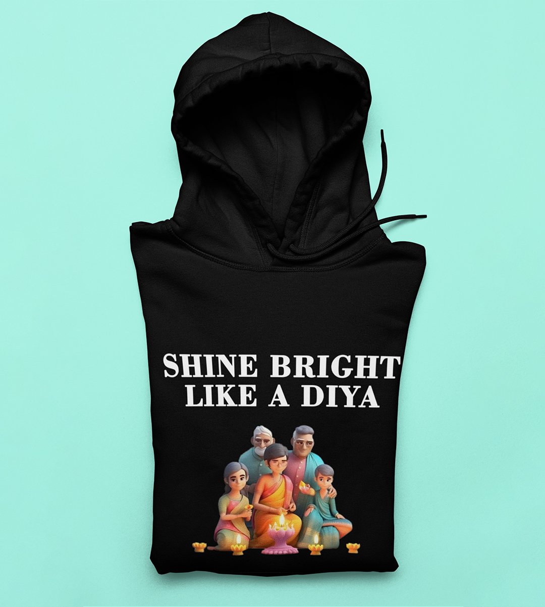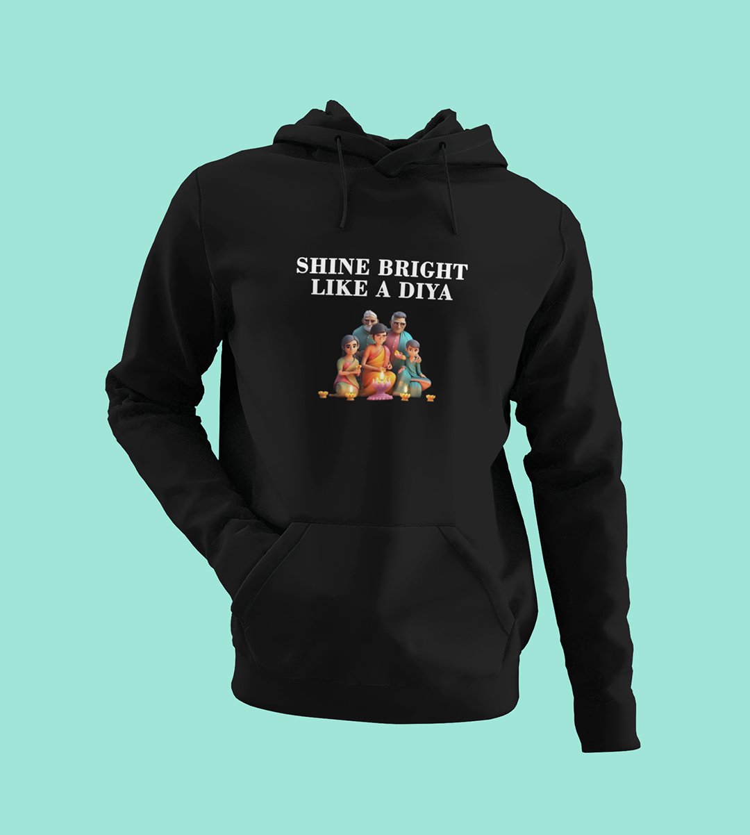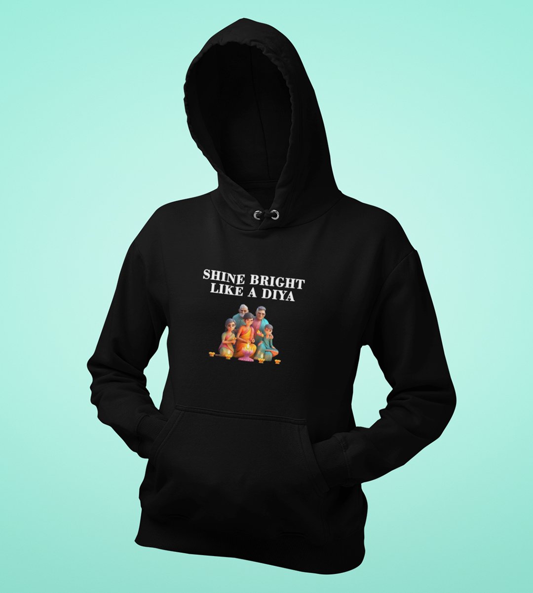 Embrace the luminous spirit of Diwali with our "Shine Bright Like A Diya" black Hoodie . The heartwarming design captures the essence of family celebrating the festival, radiating the warmth and togetherness that defines Diwali. Sip your and bask in the glow of Diwali with this heartwarming black Hoodie .