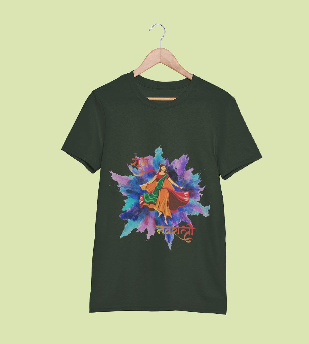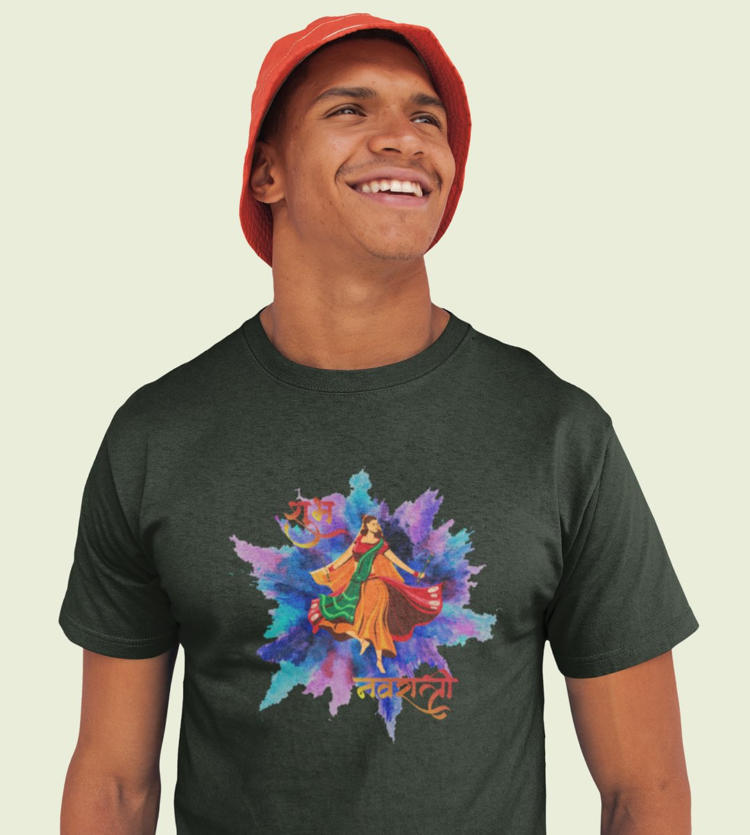 Shubh Navratri blasting colours printed unisex adults round neck cotton half-sleeve green tshirt specially for Navratri festival/ Durga puja