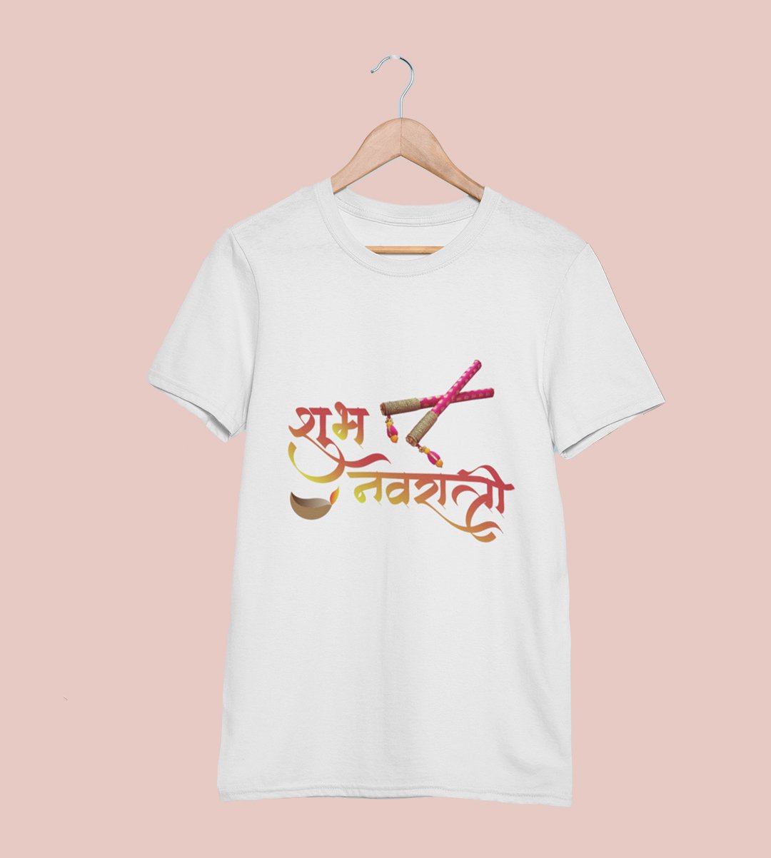 Shubh Navratri (Dandiyas) printed unisex adults round neck cotton half-sleeve white tshirt specially for Navratri festival/ Durga puja