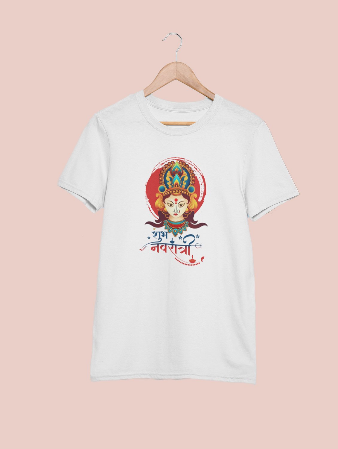 Shubh Navratri printed unisex adults round neck cotton half-sleeve white tshirt specially for Navratri festival/ Durga puja
