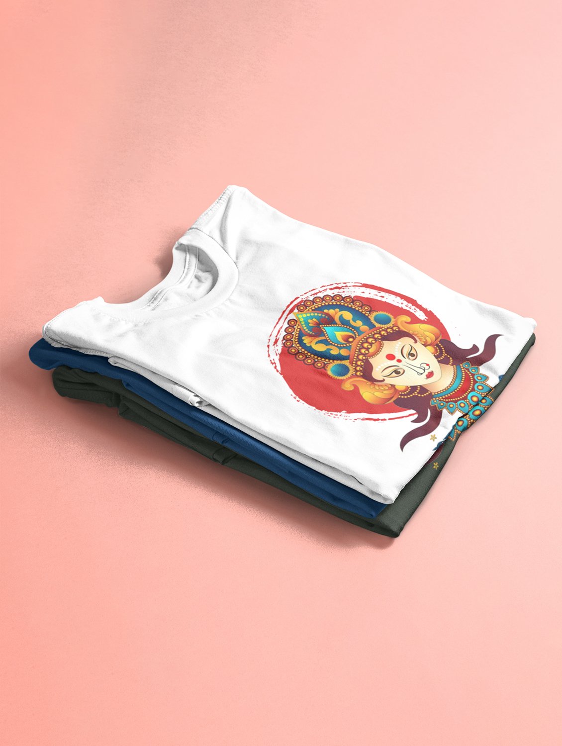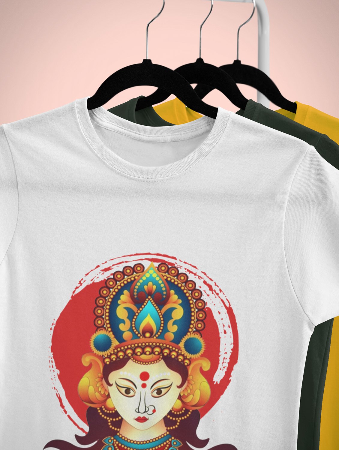 Navratri is a very auspicious festival for hindus. It takes place at the beginning of October and sometimes September. Enjoy the 9 days of festivities with full zeal and make yourself submerged in the love of Maa Durga. Navratri is also known as Durga Puja. And with this Tees, you can shine like a star during this festive season with our navratri themed cotton half sleeved Tshirts. You can pair our t-shirts with trousers and denim of your choice and make it a weekday smart casual or weekend wear. This is durable. This tshirt is smooth and soft which makes you comfortable to wear during all seasons. The printing in it is durable and odourless. It has five sizes, S,M,L,XL,XXL. The Tshirt colour is intact even after repeated washes. It can be kept in your wardrobe and hangers. Please avoid washing mashine to clean this Tee, it may affect the print. Hand wash only. We have brought you many navratri related designs printed on our different colour Tshirts to choose from. Grab it now.